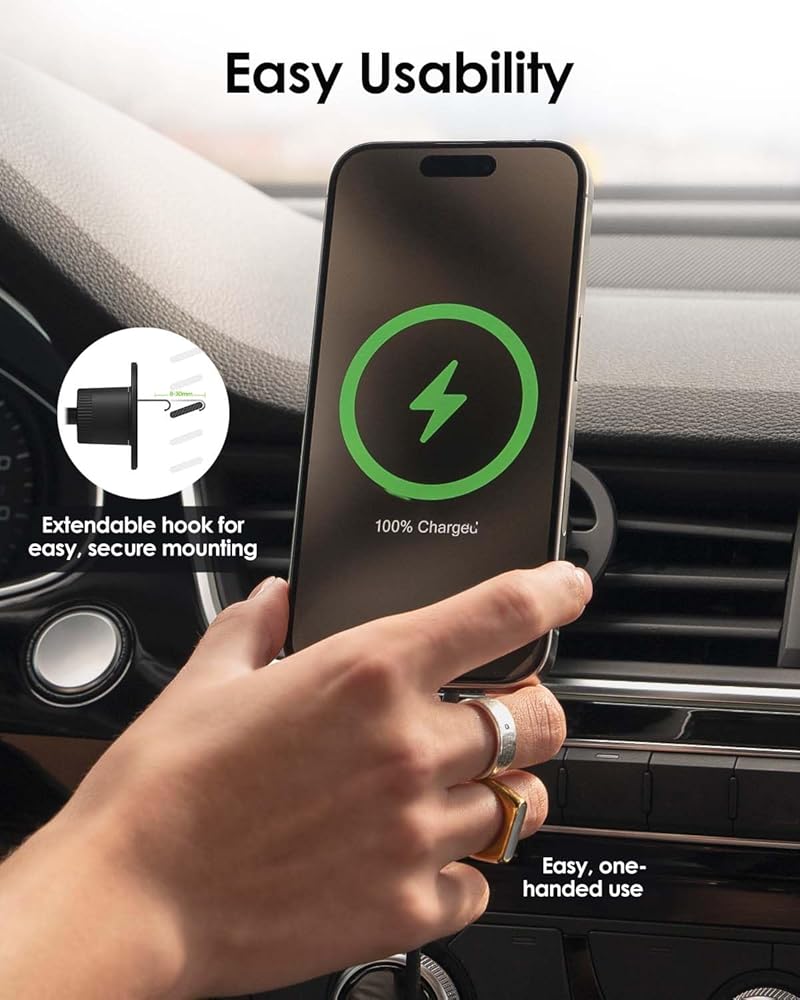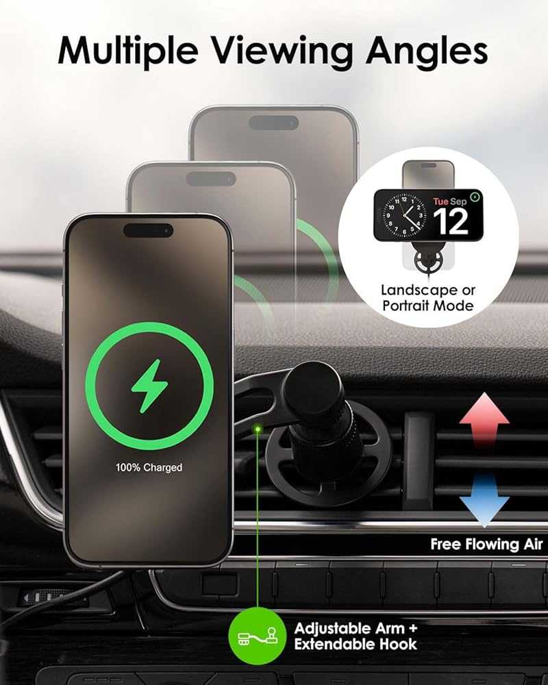 - تثبيت ثابت وآمن: يتم ربطه بقوة بفتحات تهوية السيارة بخطاف، بالإضافة إلى ذراع غير مثبت لوضع الهاتف الأمثل