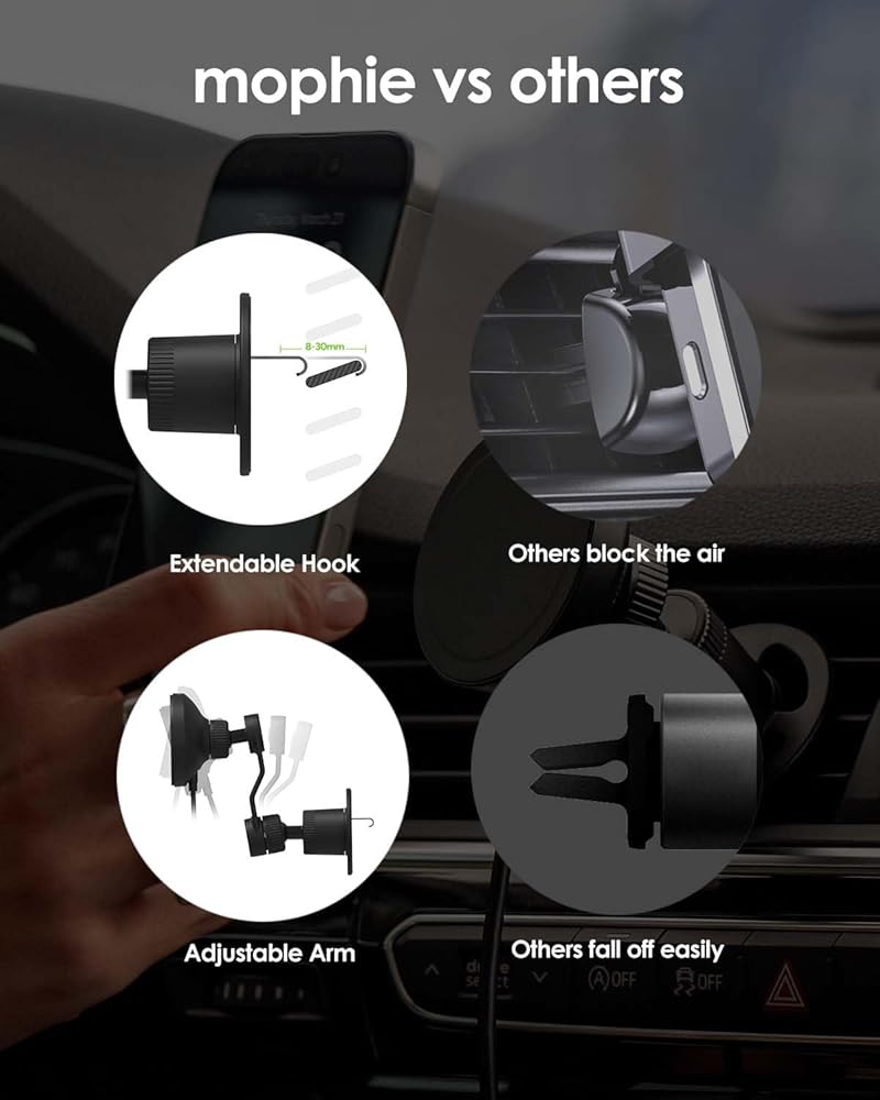 mophie Qi2 snap+ حامل فتحة شحن لاسلكي مغناطيسي - شاحن سريع 15 وات يدعم Qi لهاتف iPhone 15/14/13/12، توافق عالمي للسيارة، متضمن محول شاحن سيارة 30 وات، USB-C، أسود