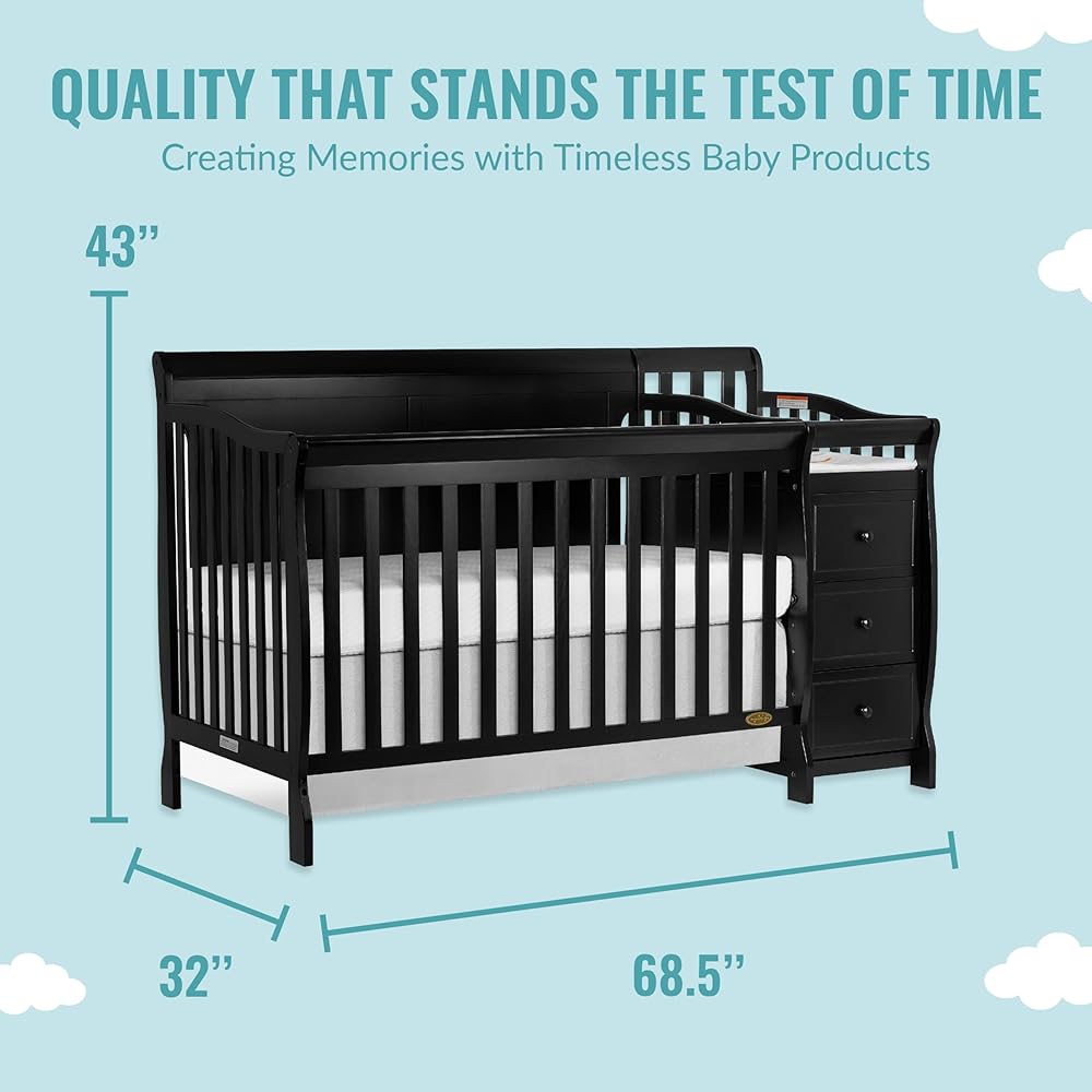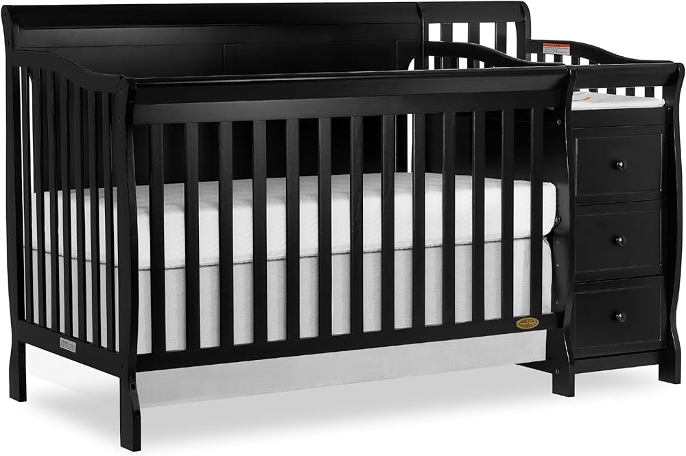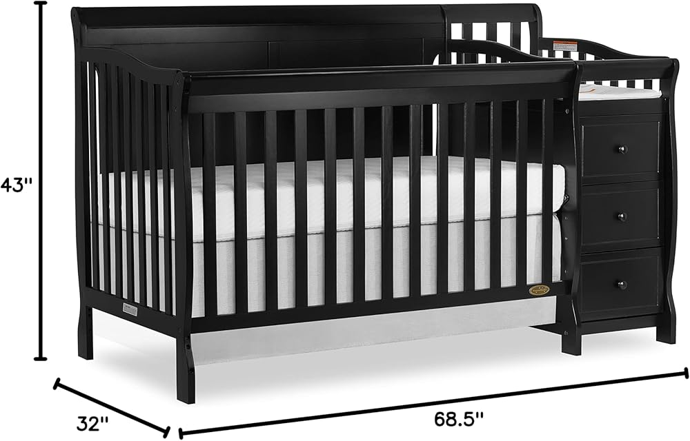 Rugged and built for the long-term, the grand Brody 5-in-1 Full Panel Convertible Crib & Changer is a must-have for any new parent. Welcome your bundle of joy into the warm and sturdy embrace of this convertible crib as it easily transitions to a daybed, toddler bed, and full-size bed with optional bedrails (bed rails and conversion kit sold separately).NOTE: The changing table can be used as a standalone piece only in full-size bed conversion mode. What's more, the Brody is designed for convenience with a detachable changing table that comes with a 1-inch-thick changing pad, an easy-release buckle, and 3 spacious drawers to hold all of your little one's essentials. As with all Dream On Me cribs, this compact yet powerful crib & changer is JPMA certified and meets or exceeds all ASTM & CPSC standards. With an eye-catching Full Panel design, it comes in 4 modern finishes – Black, Espresso, Steel Grey, & White.