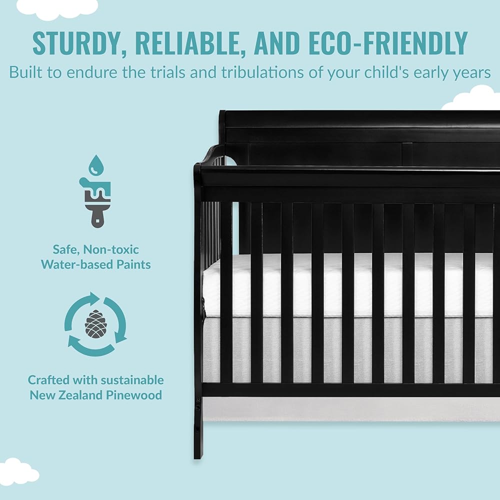 سرير برودي 5 في 1 قابل للتحويل بلوحة كاملة باللون الأسود مع مبدل وأدراج واسعة وطاولة تغيير قابلة للفصل ووسادة تغيير مقاس 1 بوصة