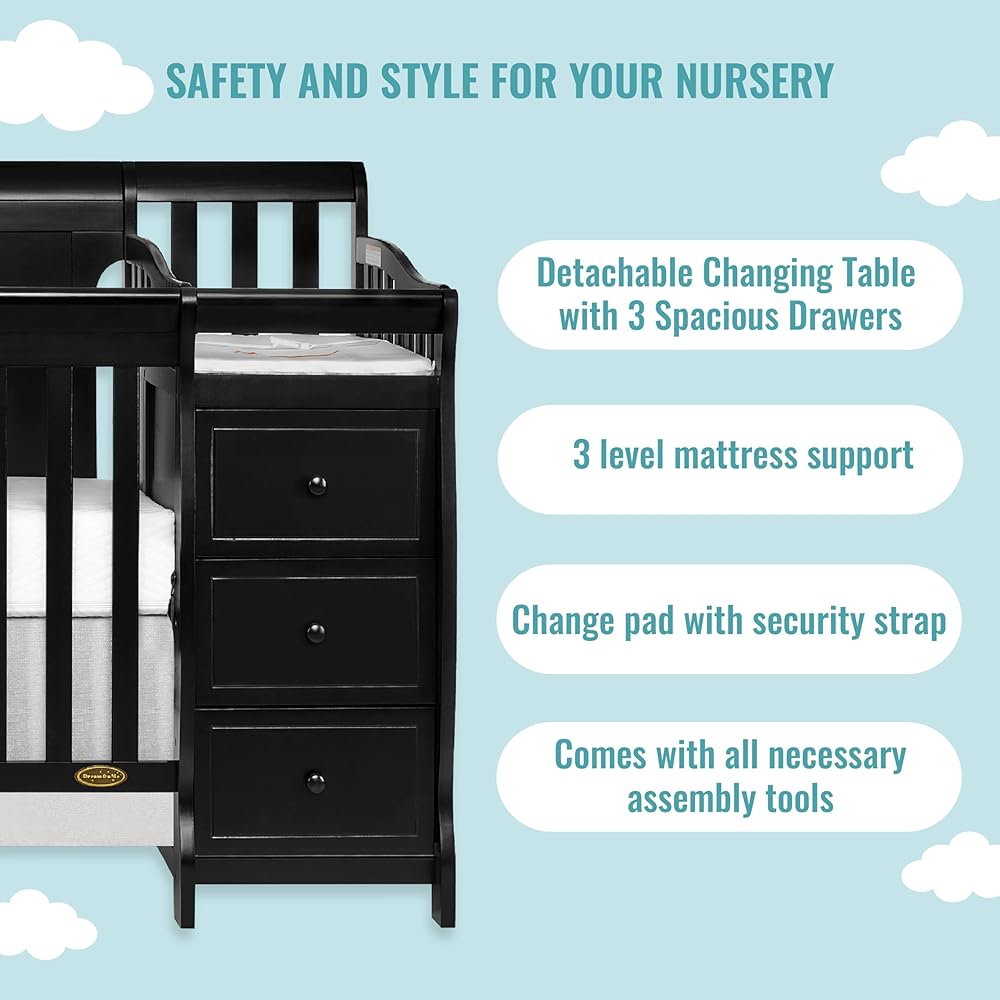 • CONVENIENTLY DESIGNED: This mini crib comes packed with all necessary assembly tools, 3-level mattress support, and a detachable changing table with a 1-inch-thick changing pad. NOTE: The changing table can be used as a standalone piece only in full-size bed conversion mode.