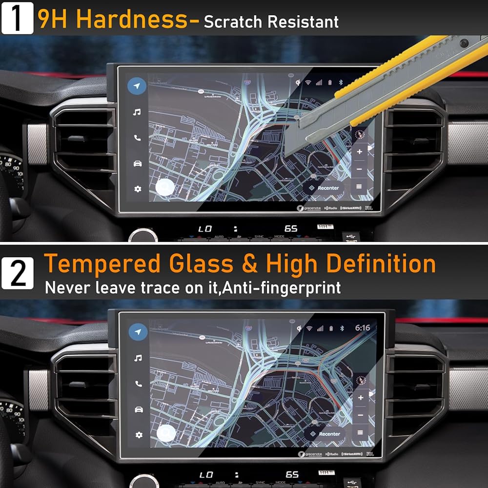 • 【سهل التركيب】واقي شاشة من الزجاج المقسى عالي الجودة متوافق مع 2024 Toyota Tacoma، 2022-2024 Tundra، 2023 2024 Sequoia. اتبع التعليمات، سيكون من السهل جدًا تركيب واقي الشاشة. يمكن تنظيف المنتج عن طريق المسح بلطف. تأتي عبوتنا مع مسح الكحول ومزيل الغبار وقطعة قماش للتنظيف لتنظيف شاشة اللمس بشكل صحيح.