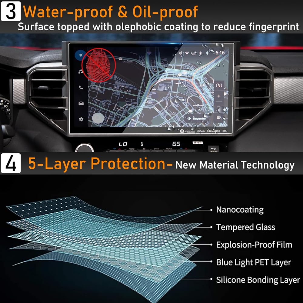 • 【واقي شاشة حماية من 5 طبقات 】مصنوع من مواد زجاجية مقواة عالية الجودة. واقي شاشة سيكويا 2023 2024 مع 5 طبقات واقية، طلاء النانو، طبقة مقاومة للانفجار، طبقة مقاومة للخدش، طبقة زجاجية مقسى، طبقة مضادة للانفجار وطبقة امتصاص إلكتروستاتيكية ، والتي تحمي شاشة اللمس الخاصة بسيارتك من الغبار والماء والزيت والخدوش وبصمات الأصابع.
