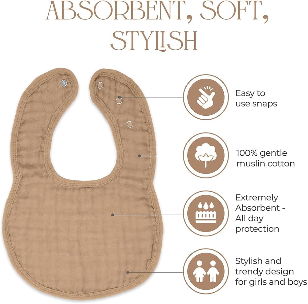 عالية الامتصاص: صدريات مريحة من قطن الموسلين ذات قدرة امتصاص عالية، مما يجعلها الحل الأمثل لالتقاط اللعاب والسوائل المنسكبة والفوضى، مما يحافظ على طفلك وملابسه جافة ومحمية طوال اليوم.
