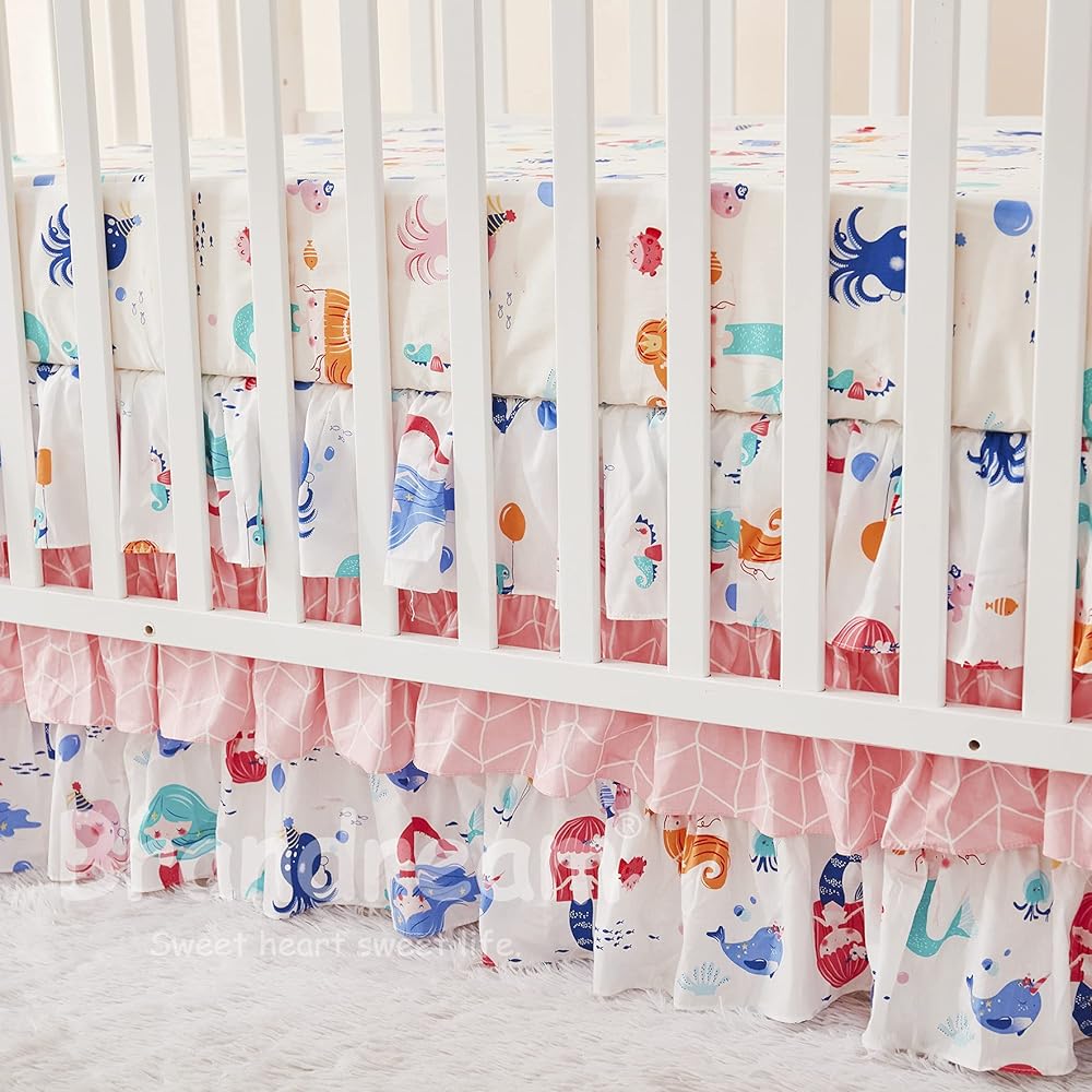 مجموعة مفروشات سرير حورية البحر من براندريم للفتيات باللون الوردي لحضانة الأطفال، مفروشات بحرية مكونة من 3 قطع، مجموعة بطانية حيوانات المحيط، ملاءة سرير من القطن الناعم، تنورة سرير من 3 طبقات