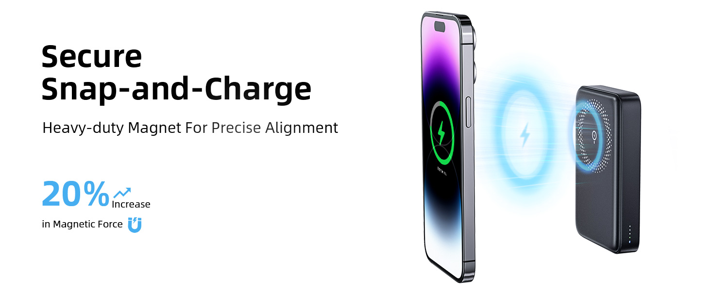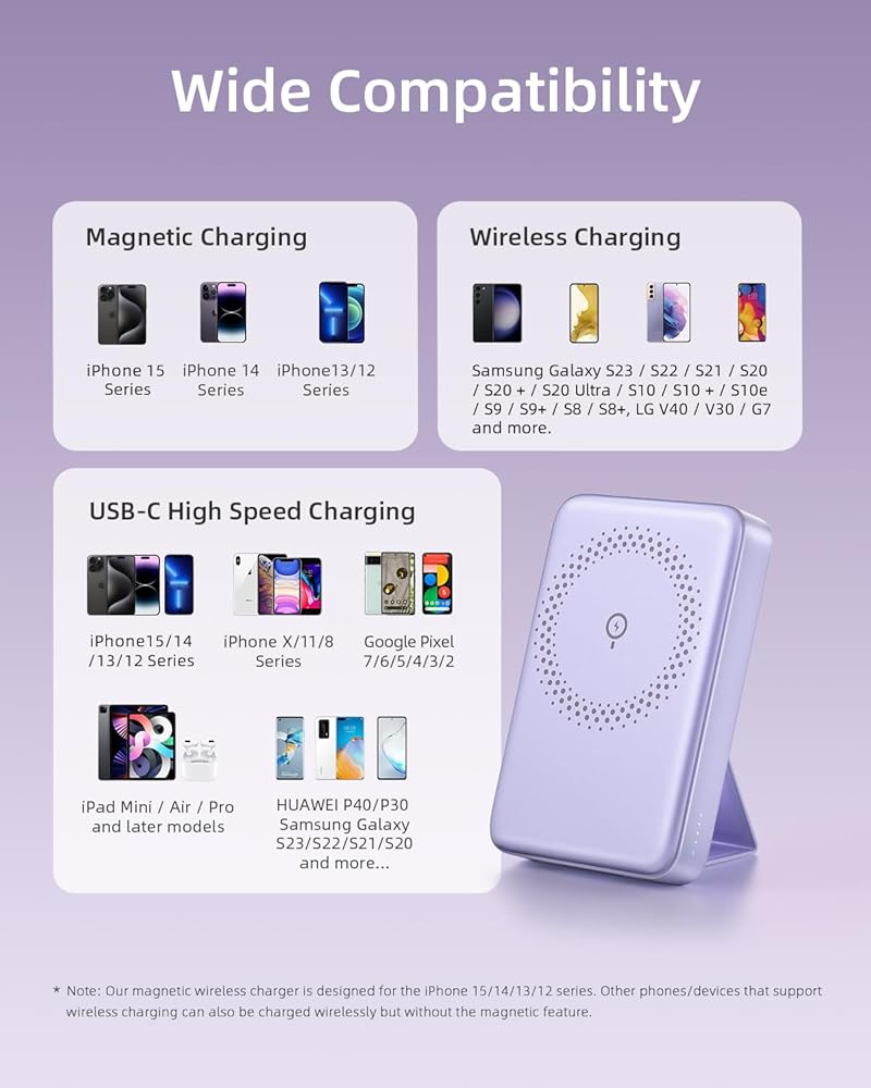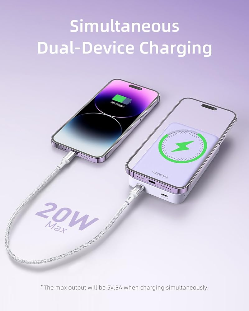 [شحن سريع] - يدعم شاحن البطارية المغناطيسي لجهاز iPhone ما يصل إلى 7.5 واط شحن لاسلكي و20 واط PD شحن سريع عبر كابل USB-C. ويمكنك اختيار الطريقتين السلكية واللاسلكية عبر USB-C لشحن جهازين في نفس الوقت.