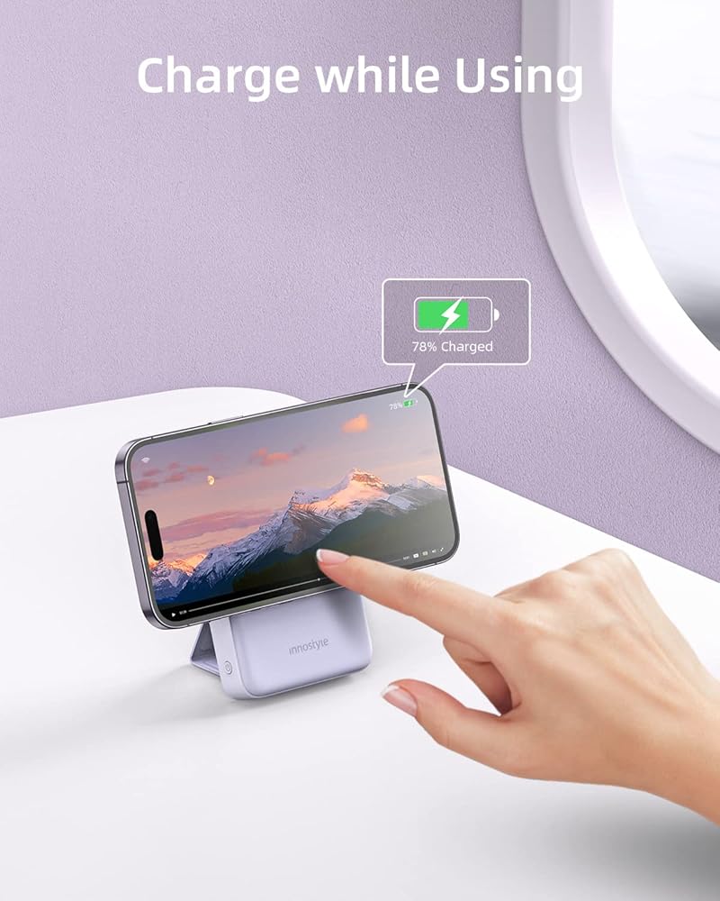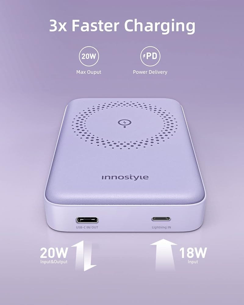 [Snap to Secure Charge] - يتم توصيل الشاحن اللاسلكي المحمول المغناطيسي من Innostyle بجهاز iPhone الخاص بك بمغناطيس من أجل محاذاة دقيقة تلقائية وشحن لاسلكي فعال. بالإضافة إلى ذلك، فهو يحتوي على ميزات أمان مدمجة مثل التحكم في درجة الحرارة والحماية من التحميل الزائد لتوفير حماية شاملة.