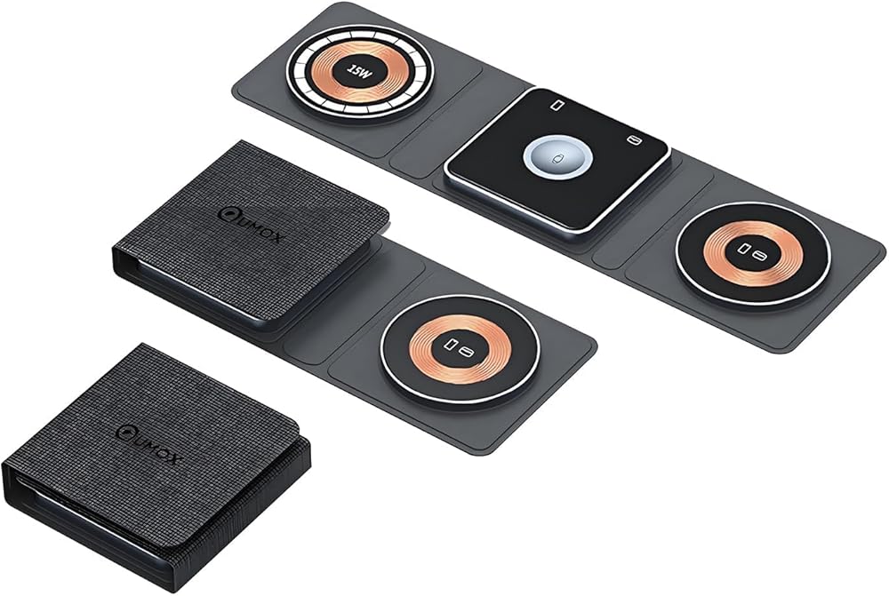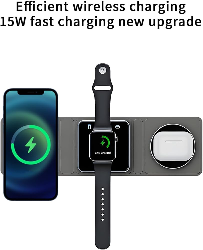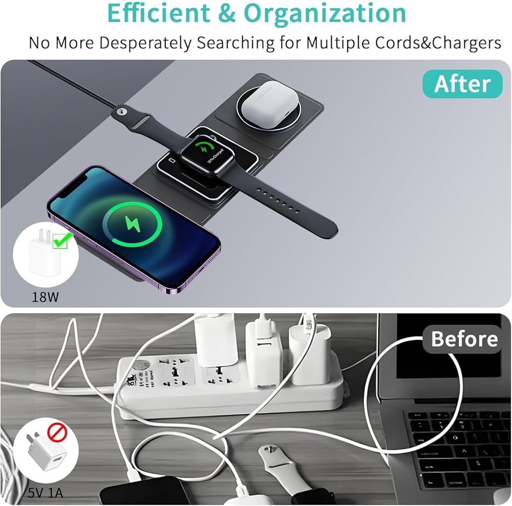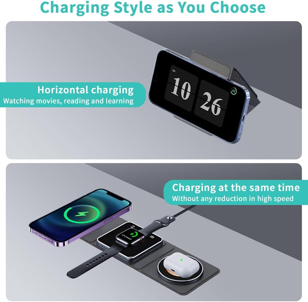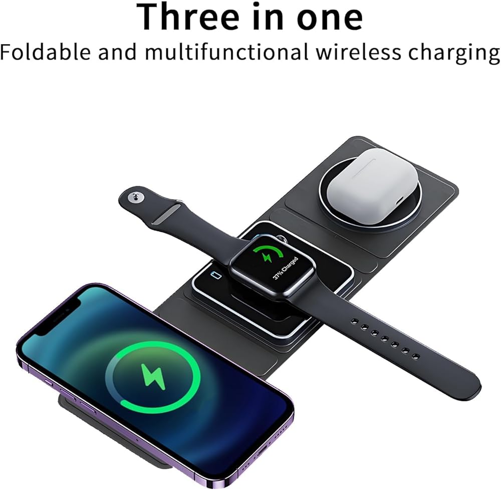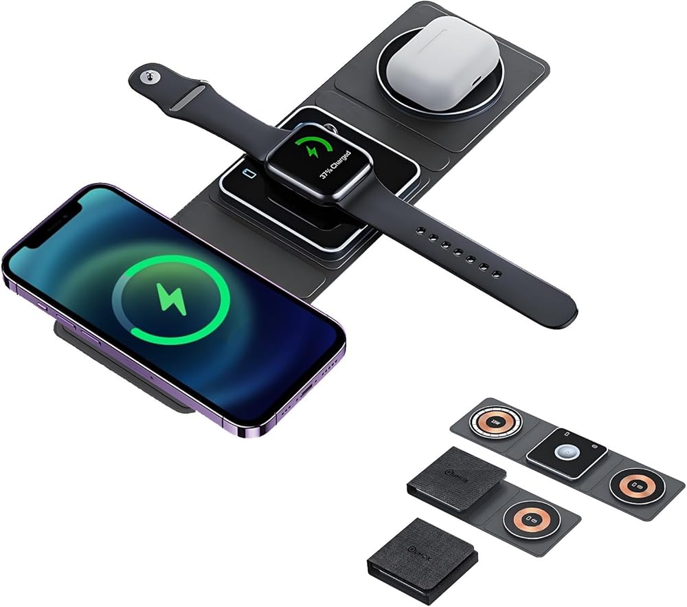 Keep your desk neat and clutter-free with the Qumox Magnetic Travel Wireless Charging Station. This foldable 3-in-1 charger is designed to simultaneously charge your iPhone, iWatch, and AirPods, providing a convenient and organized solution for all your charging needs.