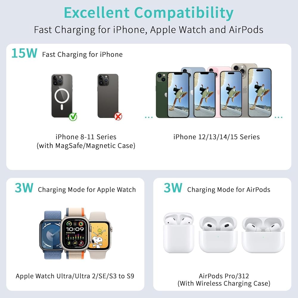 Compatible with a range of Apple products, including iPhone 15/14/13/12/Pro/Max, iWatch, and AirPods 3/2/Pro, this charging station ensures compatibility with your devices.
