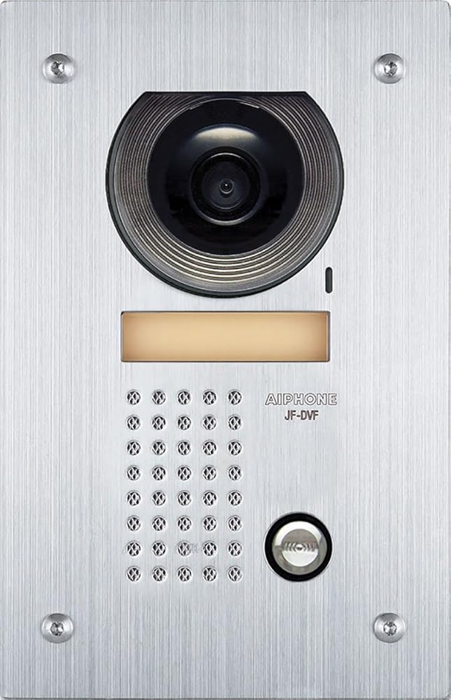 The Aiphone JF-DVF flush-mount audio/video door station works with an Aiphone JF Series master station (sold separately) to enable remote communication with visitors prior to authorizing access to the building. The station includes a 1/4" color camera that sends live video feed to a master station when a visitor presses the illuminated call button. A white LED illuminates the visitor area to brighten the video feed in low-light environments.