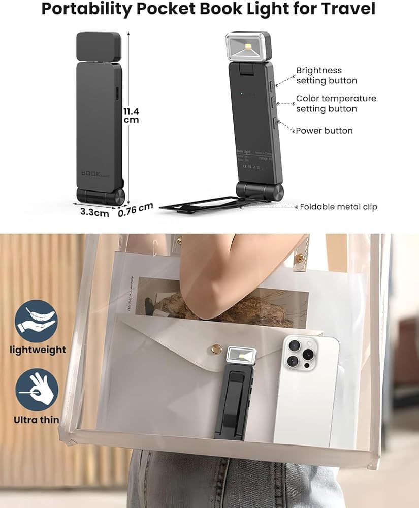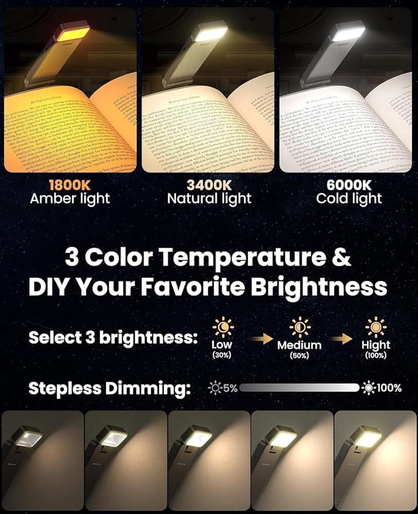 ضوء كتاب قابل لإعادة الشحن للقراءة في السرير، مصابيح LED لقراءة الكتب مع مشبك، مثالي لديدان الكتب وإضاءة السيلفي