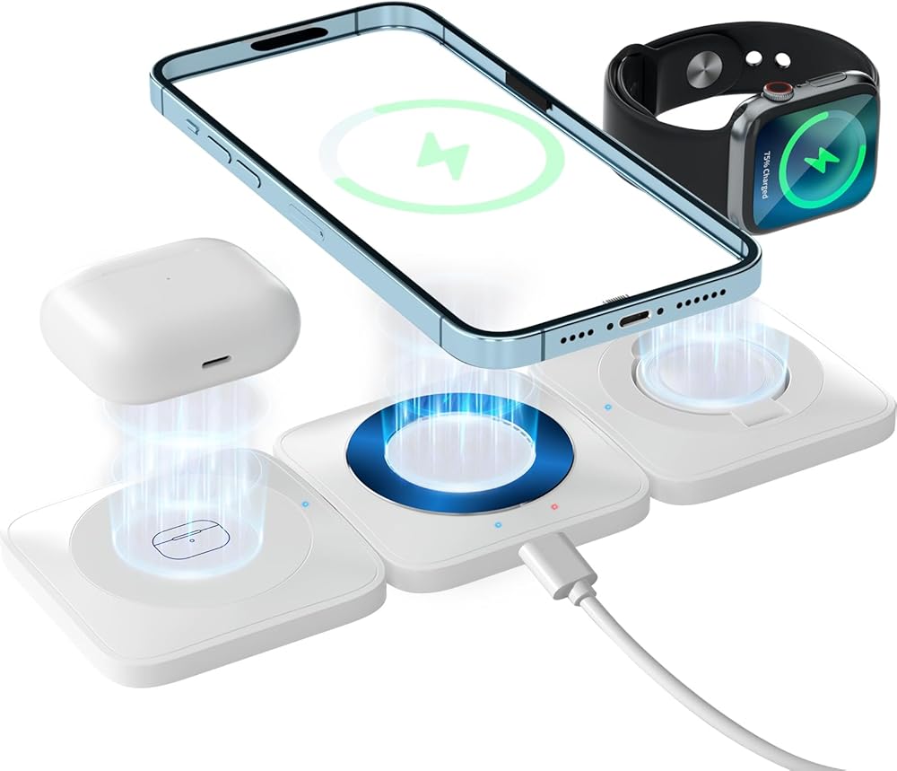 شاحن لاسلكي 3 في 1 لهاتف iPhone، قاعدة شحن لاسلكية مغناطيسية محمولة 3 في 1، شاحن سفر لأجهزة متعددة، لهاتف iPhone 15 14 13 Pro Max، AirPods، Apple Watch - أبيض (المحول غير متضمن)