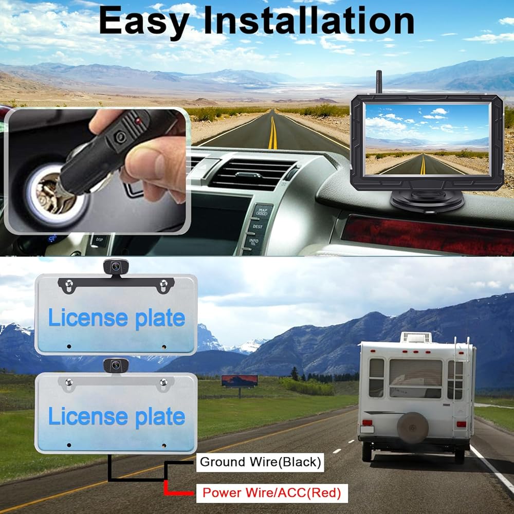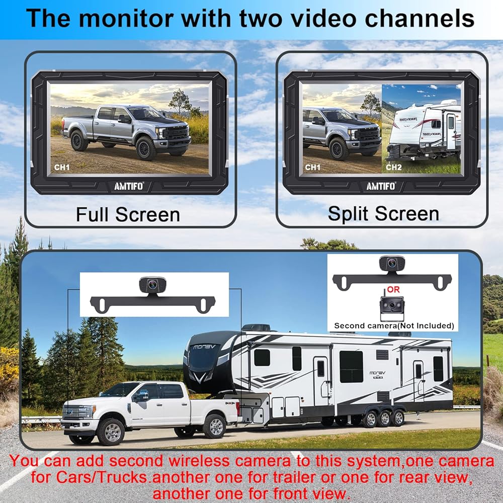 ► Back up camera systems wireless with 4.3 inch split screen can add to 2nd License plate camera or another rv backup camera