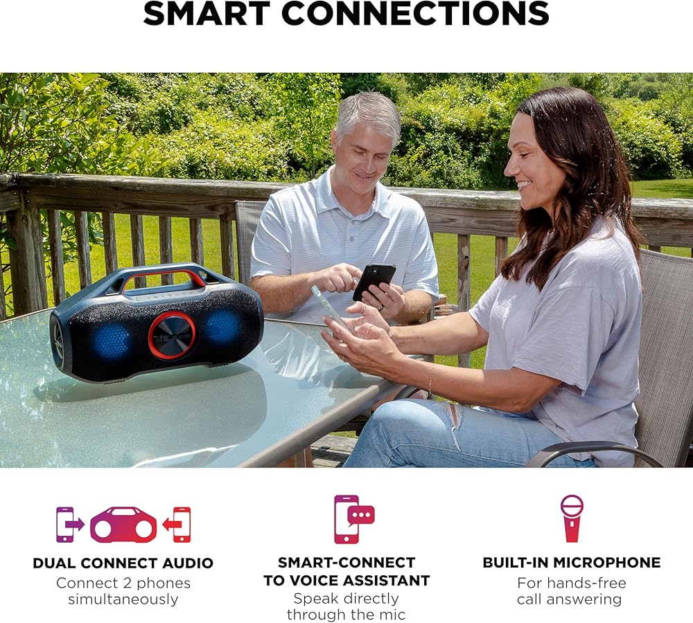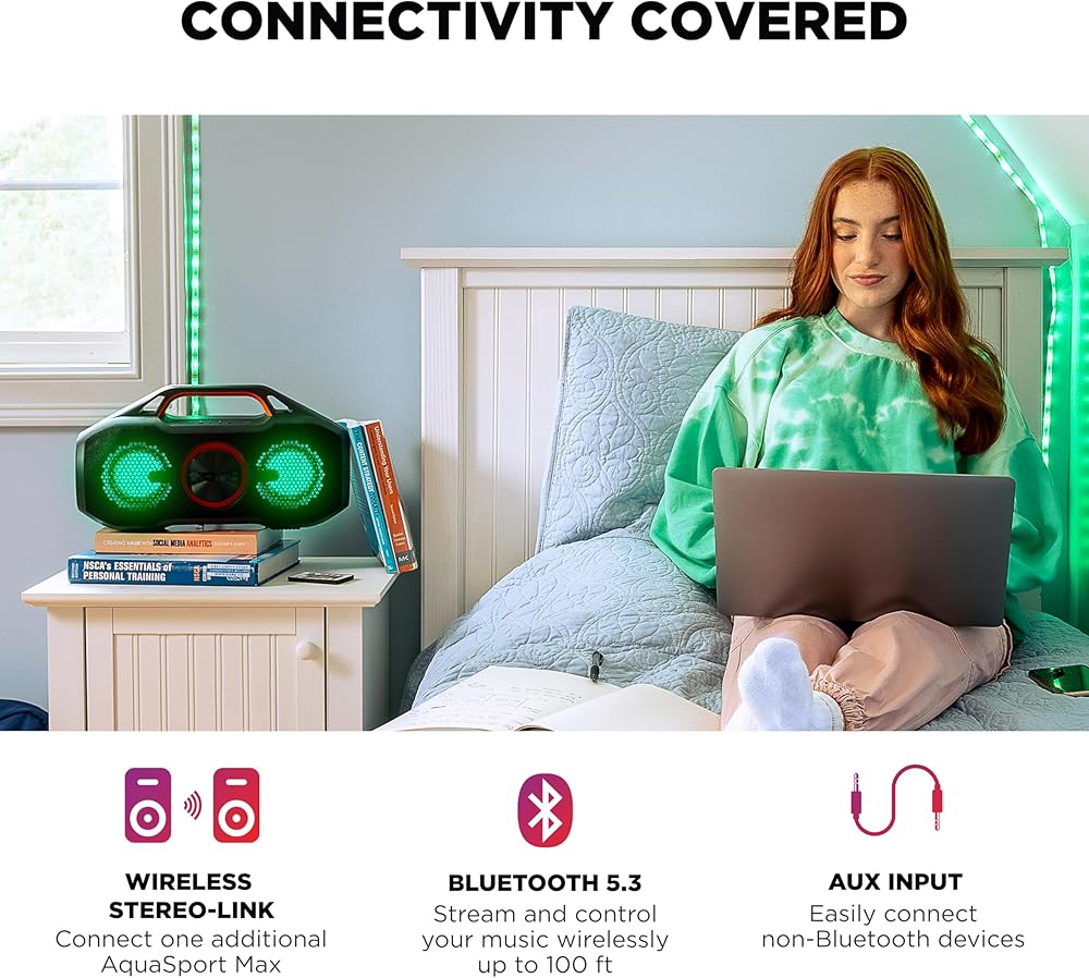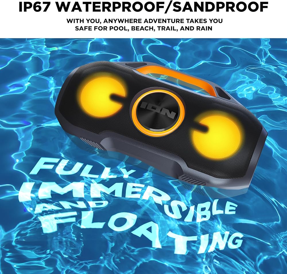 • Portable Wireless Party Speaker - Stream and control your music up to 100 ft via Bluetooth 5.3, connect your mobile devices via the AUX in; fully immersible, safe for pool, beach, trail and rain