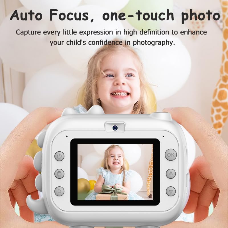 【Multi-functional Kids Digital Camera】 This is a kids digital camera with 2.4-inch IPS eye-protecting screen. It not only has instant printing function, but also supports 1080P video recording and playback, and comes with a variety of fun photo frames and filters to make your child's photos more vivid and interesting. The camera also includes 5 puzzle games to stimulate your child's mind and exercise. With features such as timer photo, continuous shooting, 16x zoom, loop shooting, music player, auto shut-off and screen saver, kids will have fun while capturing every moment.