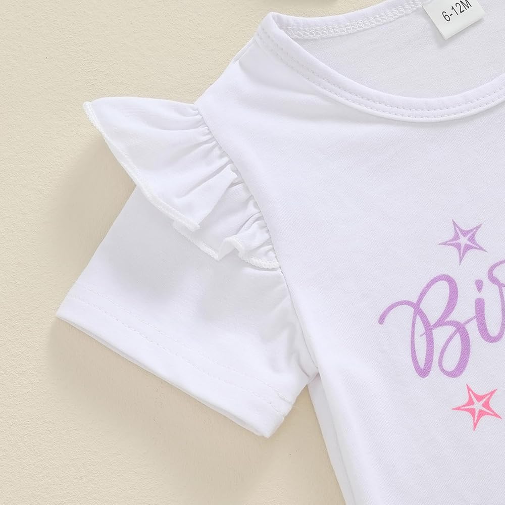 المواد: زي طفلة عيد ميلادي الأول، زي فتاة عيد ميلاد طفلي الأول، طقم رومبير وسروال قصير لعيد ميلاد طفلة، هذا الرداء مصنوع من 95% قطن، 5% إيلاستين، وسروال قصير مصنوع من 65% قطن، 35% إيلاستين، ناعم، صديق للبشرة، ومريح للارتداء في الصيف.