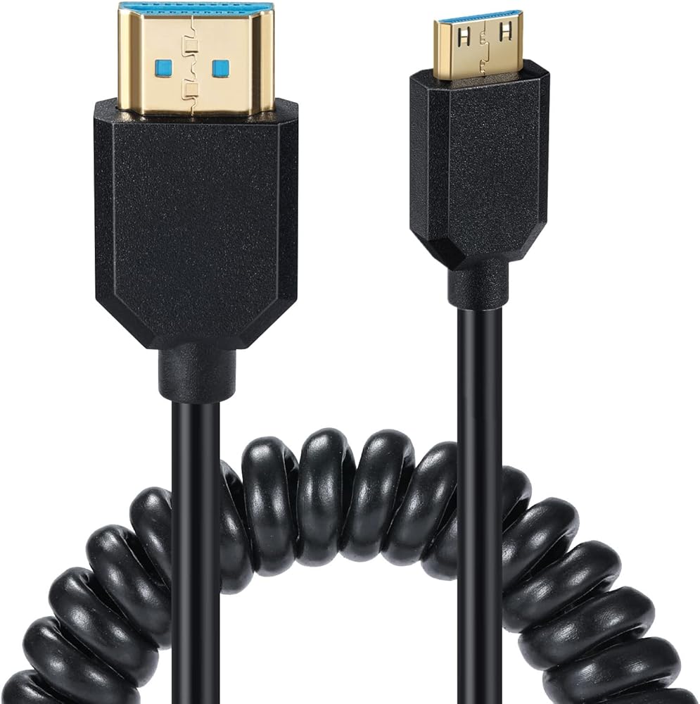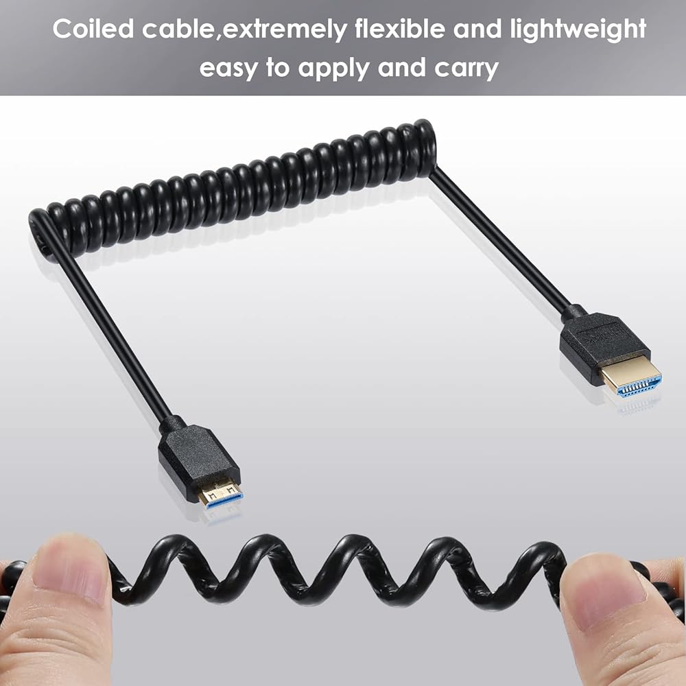 mini HDMI to HDMI helical spiral cable, high toughness, reinforced interface to resist breakage, long service life and more stable output. Cable can be stretched up to 1.2 meters, with a normal resting length of 0.6 meters.