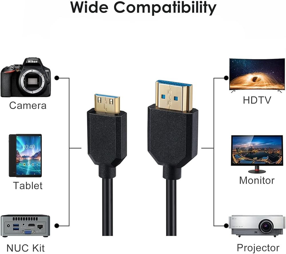 High-speed Mini HDMI to HDMI cable, A to C type, Meets the latest HDMI standards, (8K@60HZ,4K@120HZ) that supports up to 48Gbps, Compatible with Raspberry Pi Zero, Pi zero w, Lenovo ThinkPad Yoga 12" Laptop, NUC Barebone Desktop, Geforce GT 430 Graphics Card, Graphics Card, Video Camera, Nvidia Shield K1 Tablet, Pico Projector, Sony HDR-XR500, Nikon D3200, Nikon D810, DSLRs and more Canon cameras with mini HDMI ports.