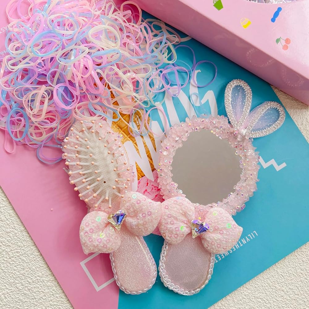 Package include: You will get a package with 1000pcs Hair Ties, 1pc Elastic Band Cutter, 1pcs hair brush, 1pcs hand mirror set. Adorable Design: Child-Friendly Designs, Versatile colors give you more options for different outfits. Painless Rubber band cutter can cut hairbands easily. Size for Travel: Hair brush and hand mirror set is easy to hold and suit for girls and kids. It is lightweight and easy to carry, fit for travel Size: The Hair Ties have an approximate diameter of 0.5 inches which making them perfect for those baby girl infant toddlers with fine hair. Ties Material:Rubber. All the products have been tested and are safe for use. Great Gift Choice: All the ties and hair brush hand mirror set are packed in the gift box. It's a good gift choose for girls, toddlers, kids, teens.