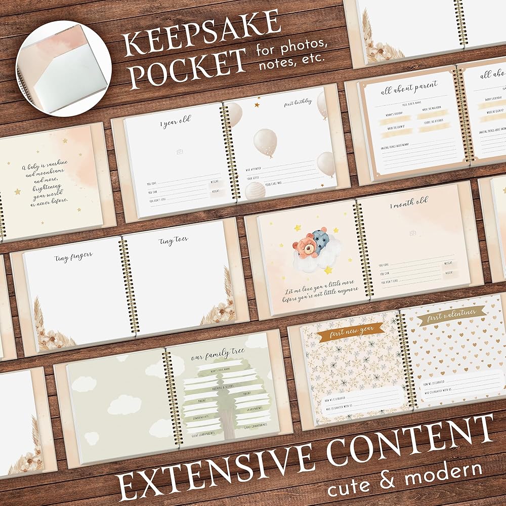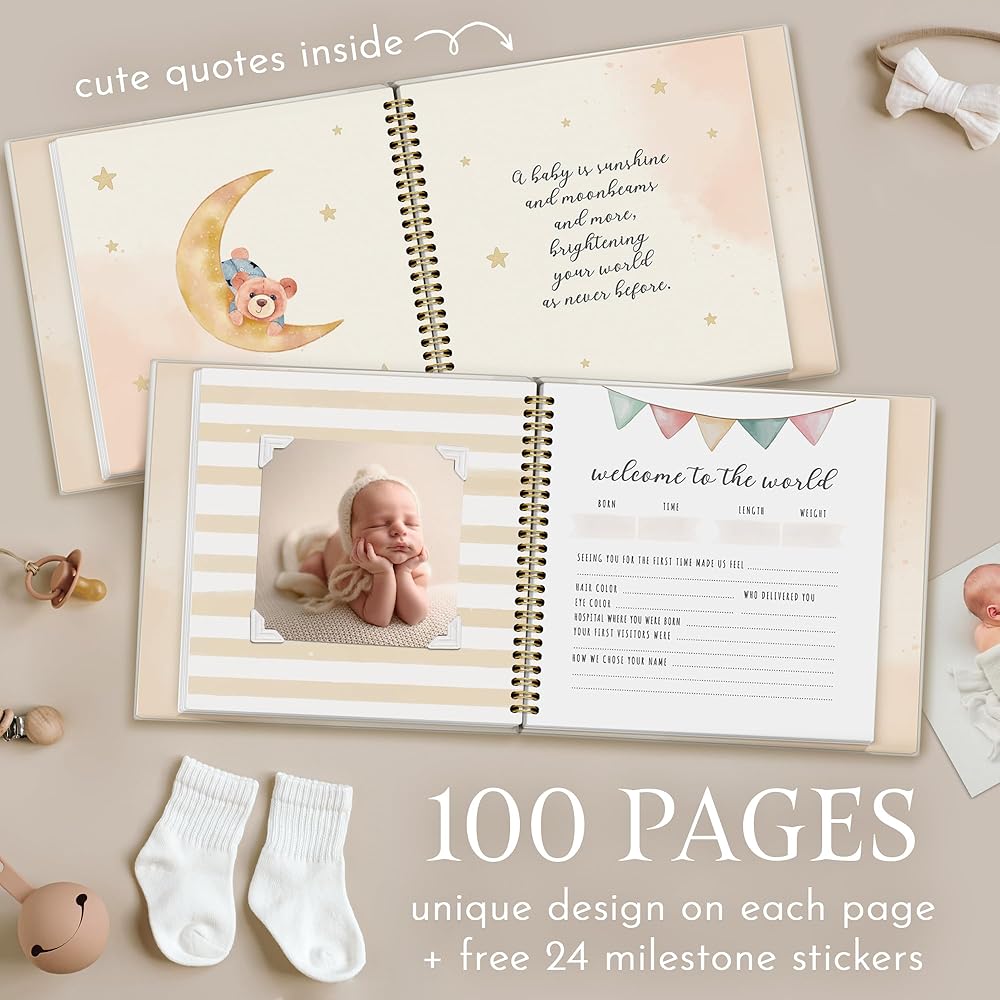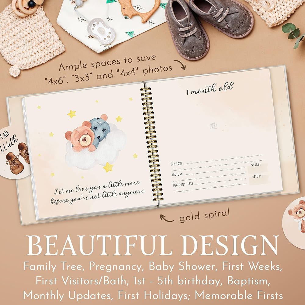 Meticulously and Beautifully Crafted Baby Memory Book. Our Baby 5 Years Journal cover every stage of Event from Birth to Age 5. Family Keepsake: This Memory Book is not just for your baby, but for the entire family to cherish. It makes a wonderful gift for grandparents, godparents, and anyone who holds a special place in your baby's heart. Gender-neutral Baby Book captures your little one's journey, from Pregnancy (Pregnancy details, Baby Shower, etc), Family Tree for modern families, Birth Day (First Visitors, Page for Footprint and Handprint), Arriving Home (Going Home), Memorable Firsts (Bath, Movements, Sleep, Foods, Tooth Eruption, Quotes, First School Days), Letters to You, Early Years (Ages 1 - 5) (Yearly Summaries, Memories). Baby Album Books with dedicated pages for photos, notes, and letters to remember precious moments. Pages to relive monthly memories and feelings. Ample spaces to save “4x6”, “3x3” and 4x4 photos. Extra lined pages at the back to express your love. Baby Memory Book includes: 12 month stickers- and 12- Memorable firsts and holidays stickers ideal for Photos. The stickers easily allow new parents to photograph their baby's age, along with special milestones and holiday. Beautifully designed packaging to protect your cherished memories for decades. From the very first heartbeat to the first day of school, our Baby Memory Book with 24 Milestone Stickers captures the essence of your baby's journey. Preserve these priceless memories in a way that will be cherished for generations to come. Order now and create a treasure trove of memories to relive and share.