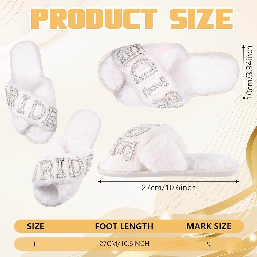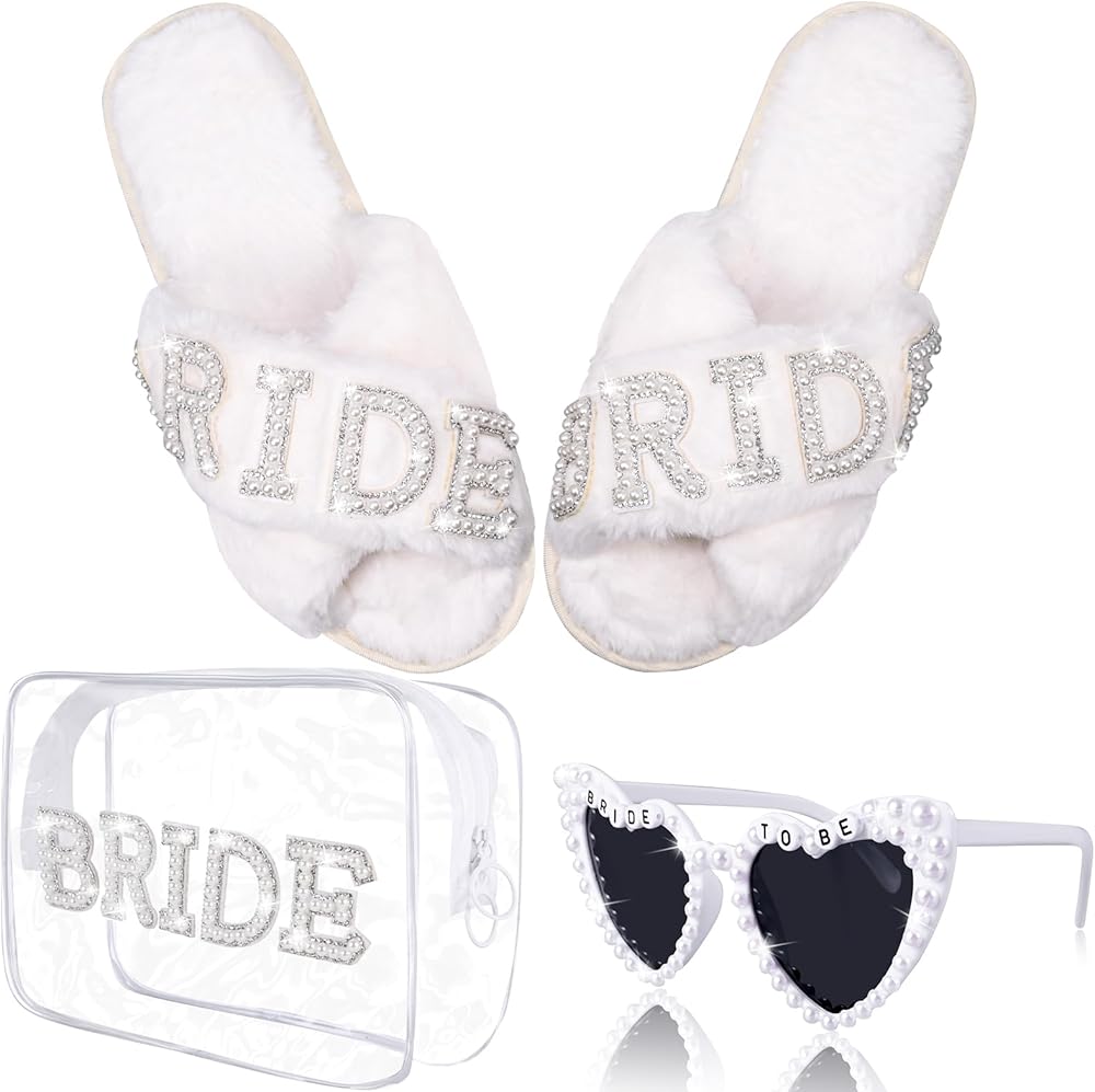 تشتمل مجموعة هدايا Bride To Be على شباشب ناعمة من حجر الراين وحروف BRIDE Bride وحقيبة مكياج العروس الشفافة ونظارات شمسية على شكل قلب أبيض لأحذية يوم الزفاف، وهدايا حفل الزفاف، وهدية العازبة