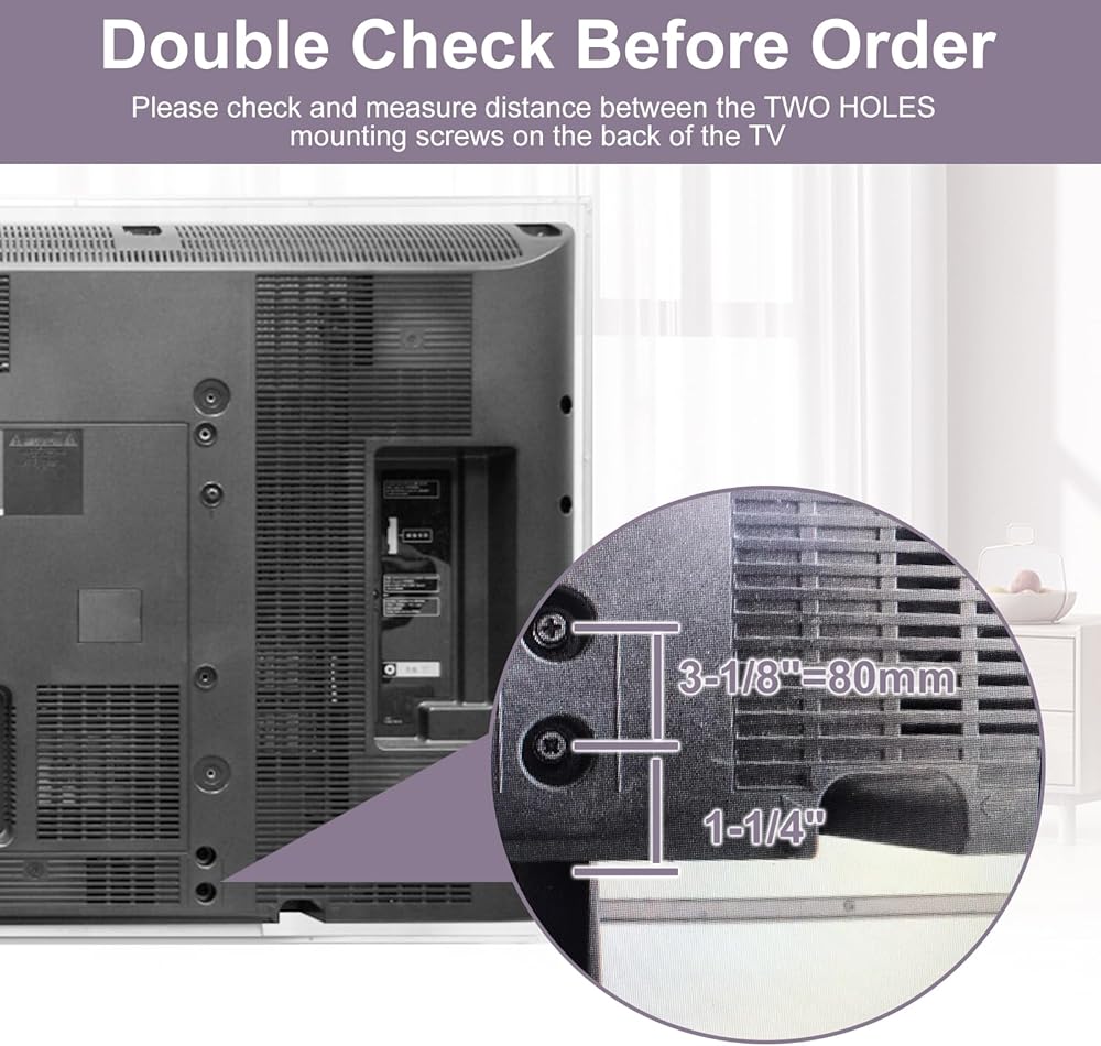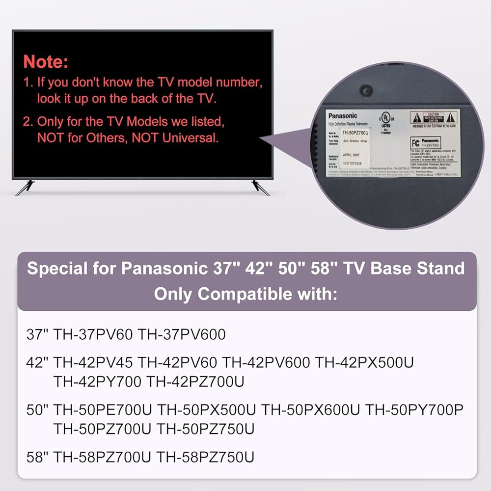 Tips: The TV legs is only applicable to the listed models for Panasonic TV.Please check your TV model and the distance between the two holes mounting screws on the back of the TV before purchasing.