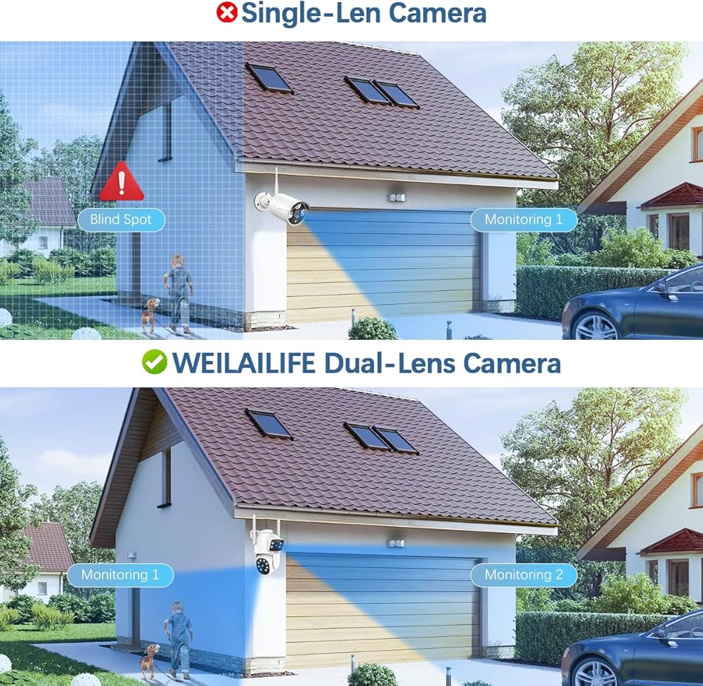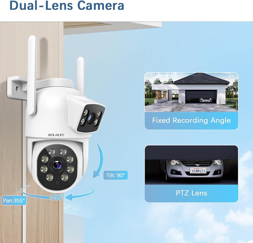 【Dual Lens Linkage & WiFi Connection】This Wireless PTZ Security Camera combines a fixed lens with a PTZ (pan-tilt-zoom) camera, enabling static monitoring of key areas while providing 355° pan and 90° tilt for comprehensive surveillance. It can monitor two areas simultaneously, expanding the surveillance coverage. Its wire-free design makes it easy to install anywhere with WiFi coverage