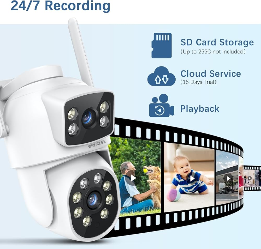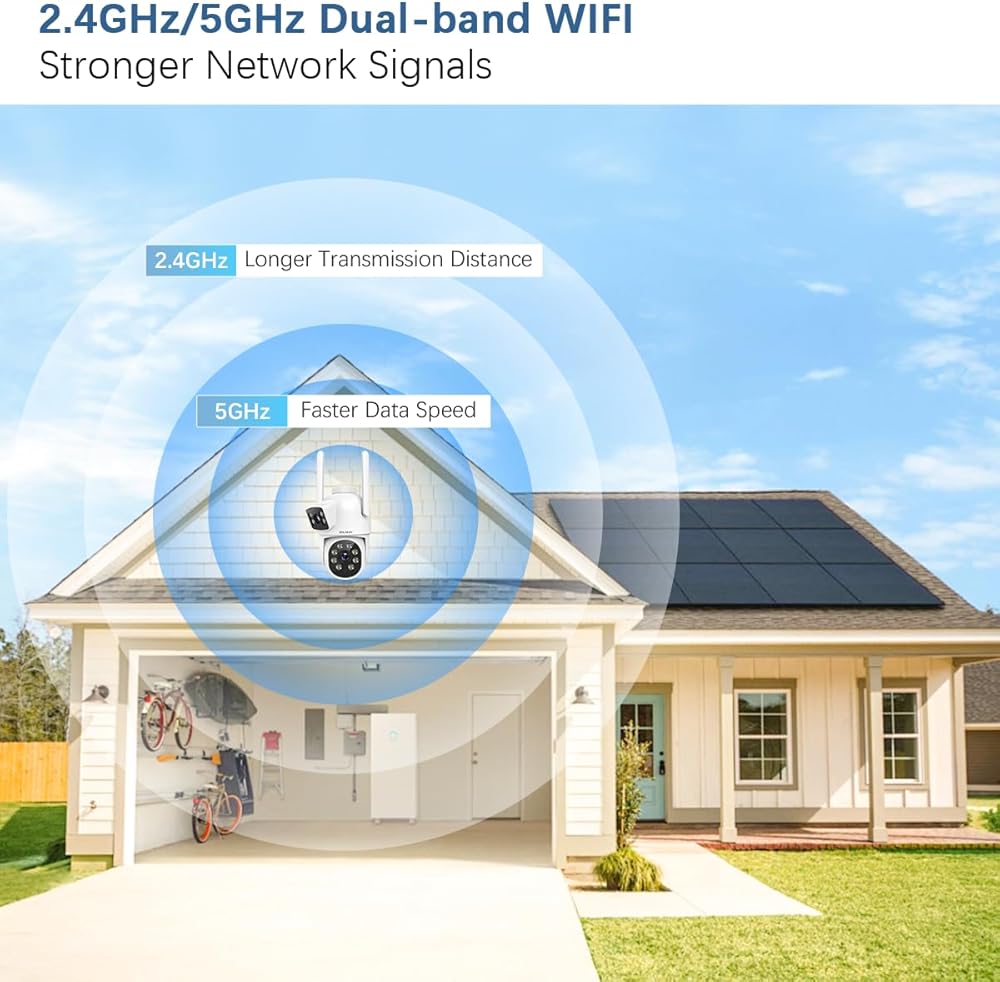 【Dual Band WiFi & Cloud/SD Card Storage】Our Outdoor Security Camera supports both 2.4GHz and 5GHz Wi-Fi, allowing for seamless switching to ensure smooth real-time feeds and stable connectivity. Additionally, you can insert an SD card with up to 256GB capacity into the camera for enhanced outdoor home security, or use cloud storage to save videos, enabling you to view full-day footage from the PTZ camera. You can share the outdoor surveillance camera with your family through the app. Absolute privacy protection ensures you are safeguarded from any potential risks.