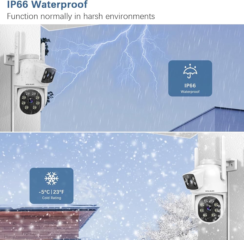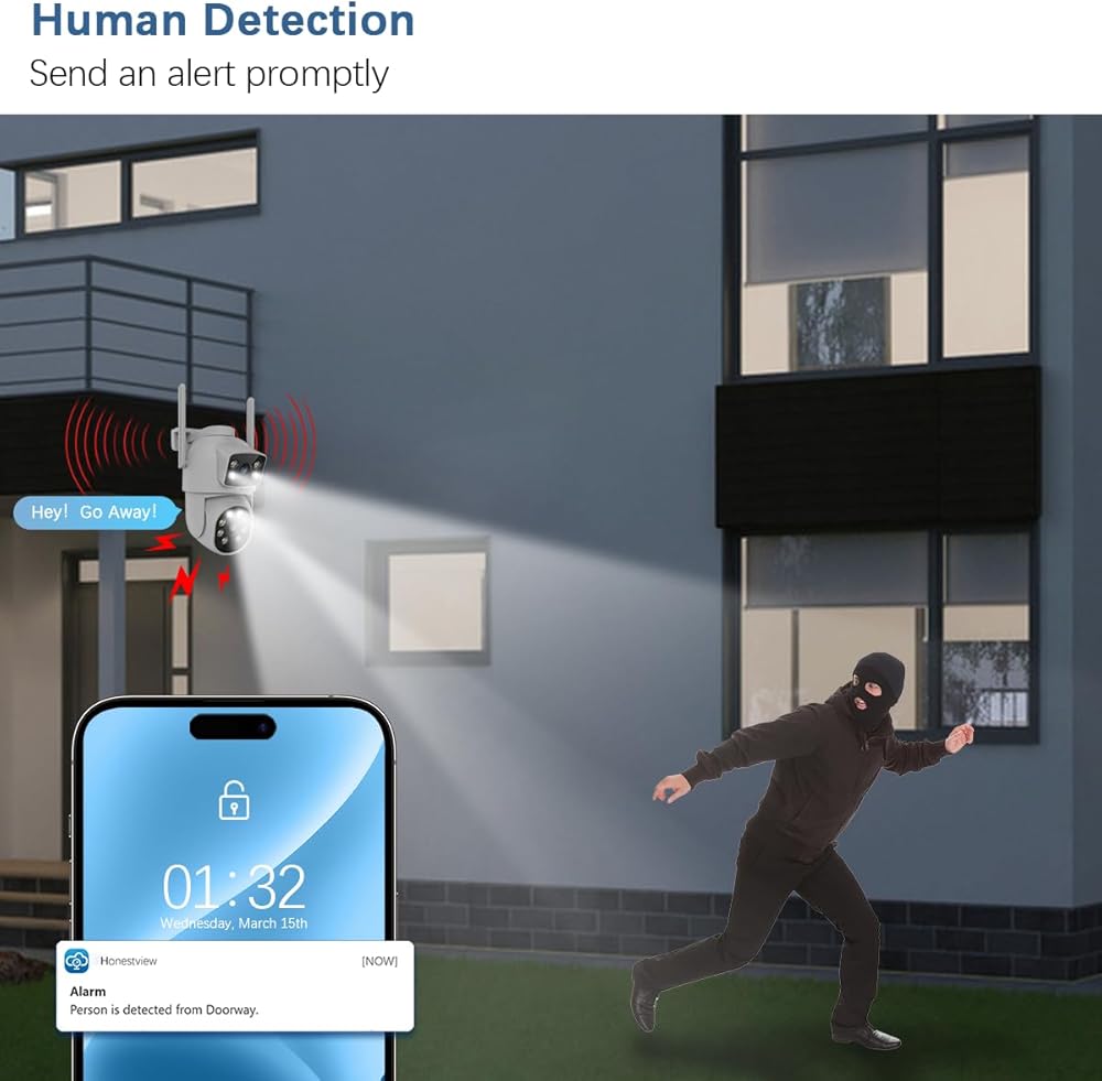 【Two-Way Audio & 4MP HD Image】 Our Outdoor Wireless PTZ Security Camera is equipped with state-of-the-art noise-canceling microphones and speakers, ensuring clear and seamless communication between the app and the cameras. This feature enables you to stay connected with your family while you're away. The two 2MP lenses expand the surveillance coverage, providing clear and smooth image quality.