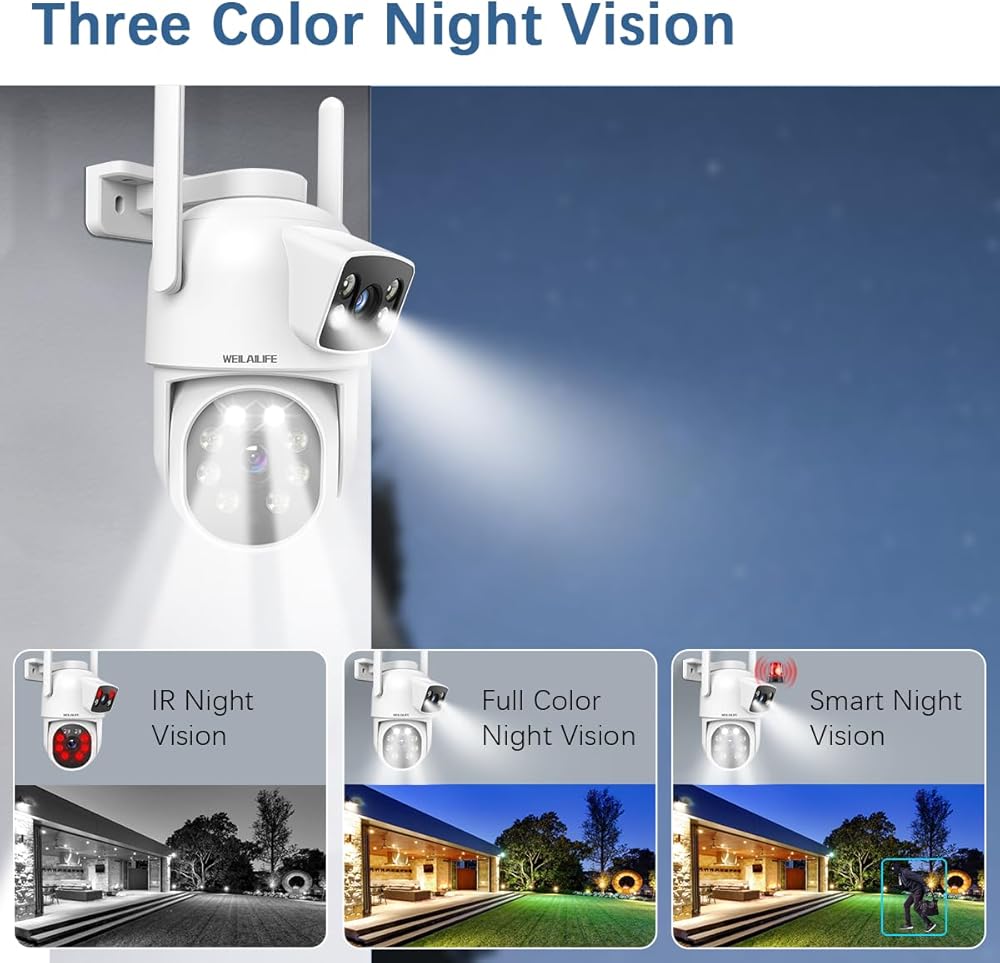 【Auto Tracking & Night Vision 】This Outdoor Security Camera comes with automatic tracking functionality.When this outdoor PTZ camera detects human movement, it will track the moving target and send an alert to your mobile phone until the subject is out of range. Then, the camera will return to the Guard Position you set.This outdoor security camera features built-in 12 lights and ensures full-color/IR night vision image. Full-color night vision delivers a clear image even in extremely dark environments. You can choose from three night vision modes.