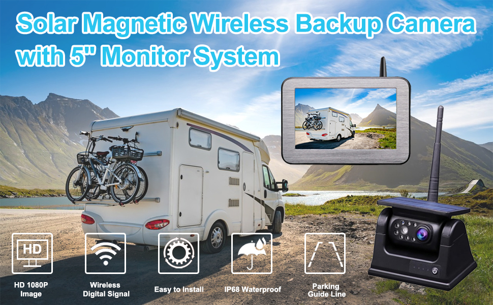 كاميرا احتياطية لاسلكية مغناطيسية تعمل بالطاقة الشمسية من B-Qtech مع نظام مراقبة 5 بوصات AHD1080P وصلة مقطورة شاحنة كاميرا الرؤية الخلفية بالأشعة تحت الحمراء للرؤية الليلية IP68 مقاومة للماء وقابلة لإعادة الشحن لكاميرا السيارة RV