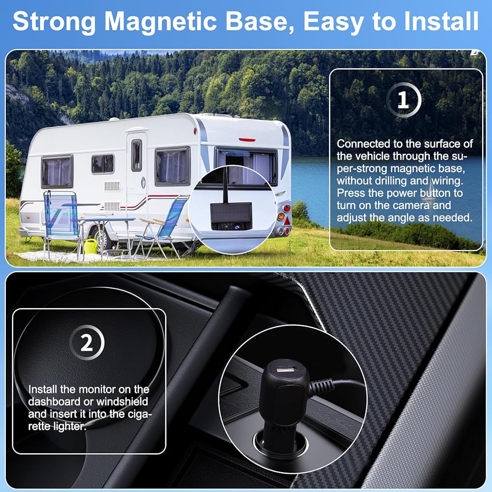 سهل التركيب في 3 دقائق: تصميم قاعدة مغناطيسية قوية، بدون أسلاك، بدون حفر. يمكن تركيب الكاميرا الاحتياطية المغناطيسية اللاسلكية على أي سطح معدني، سهلة التركيب والإزالة. مناسبة للسيارات وRV والشاحنات والشاحنات الصغيرة والشاحنات الصغيرة والتخييم والمقطورات. القاعدة المغناطيسية القوية للكاميرا العكسية الشمسية مغلفة بالمطاط، مما يمنع بشكل فعال الخدوش على سطح طلاء السيارة.