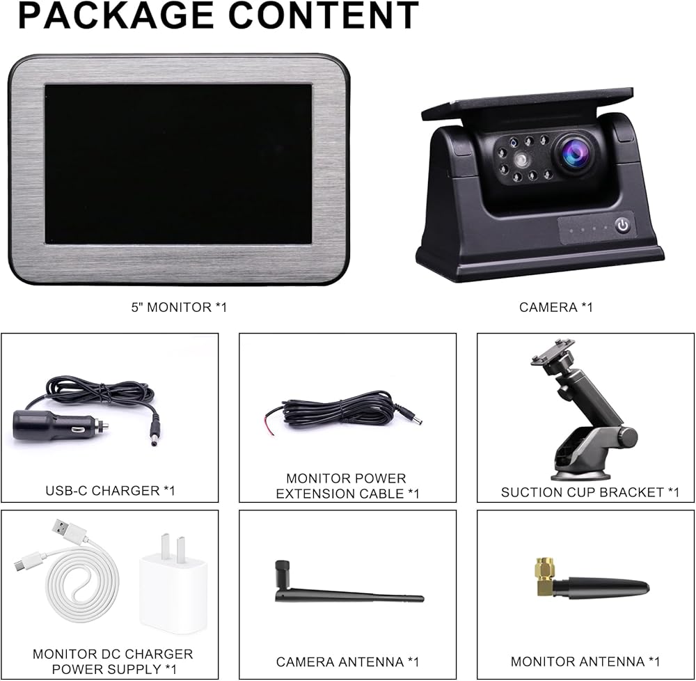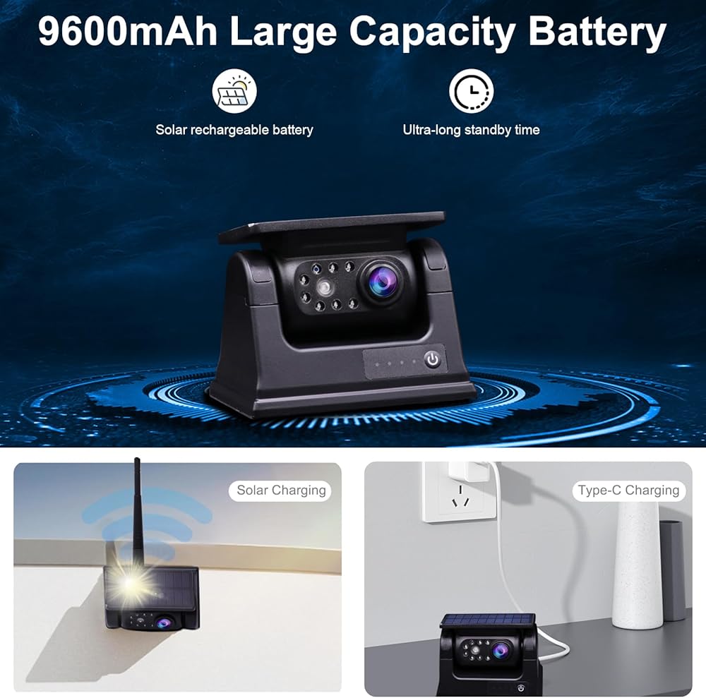 بطارية قابلة لإعادة الشحن تعمل بالطاقة الشمسية: يمكن تشغيل الكاميرا الاحتياطية اللاسلكية للشاحنات ببطارية مدمجة وأشعة الشمس. سعة البطارية 9000 مللي أمبير، ومصدر الطاقة متين، ومناسب بشكل خاص للسفر لمسافات طويلة. مجهزة بلوحة شمسية 5 واط وشاحن 5 فولت 2 أمبير من النوع C، يمكنك أيضًا شحن الكاميرا عندما تكون البطارية منخفضة أو ممطرة.