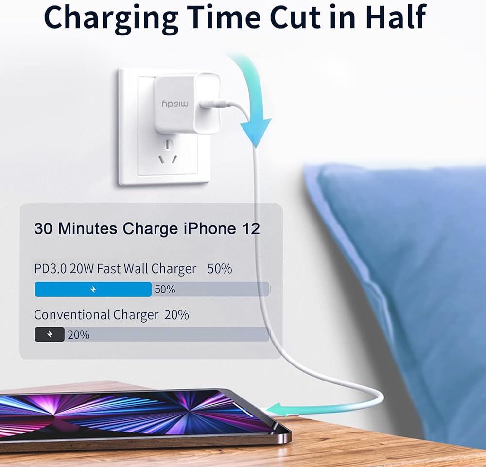 • 【شحن فائق السرعة بقدرة 20 وات】مع تقنية توصيل الطاقة والشحن السريع 3.0، يبلغ الحد الأقصى لطاقة الإخراج 20 وات. محول طاقة USB-C يشحن الهاتف 12 بسرعة من 0% إلى 50% خلال 30 دقيقة فقط، أي أسرع 3 مرات من الشاحن الأصلي بقدرة 5 وات! يوفر لك قابس الشاحن السريع USB C بقدرة 20 وات تجربة شحن فائقة السرعة.