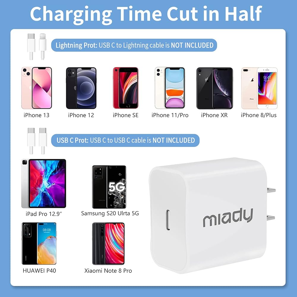 • 【الموديلات المتوافقة】شاحن حائط للسفر بقدرة 20 واط لهواتف iPhone 13، 13 Pro، Pro Max، 13 Mini، iPhone 12، 12 Pro، 12 Pro Max، 12 Mini، 11 Pro، 11، XR، XS MAX، X، Samsung Galaxy S21، S21 Plus، S21+، S20، S20 Plus، S20+، S20 Ultra، Note 20، Note 20 Plus، Note 20 Ultra، Note 10، Note 10 Plus، 2018 iPad Pro 11/12.9، 2020 iPad Pro 11/12.9 والمزيد. لاستخدام كابل USB C إلى C إضافي أو كابل USB C إلى L يعمل مع شاحن الحائط USB C هذا.