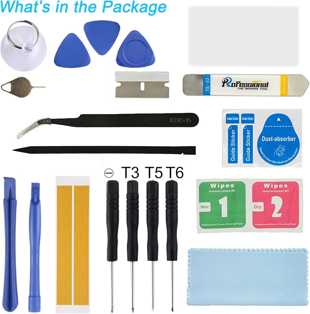 Package includes three plastic picks, metal opening tools,screw drivers, plastic card, suction cup, spudger, cleaning cloth and wipes, sim card pin, dedust absorber and adhesive tape.