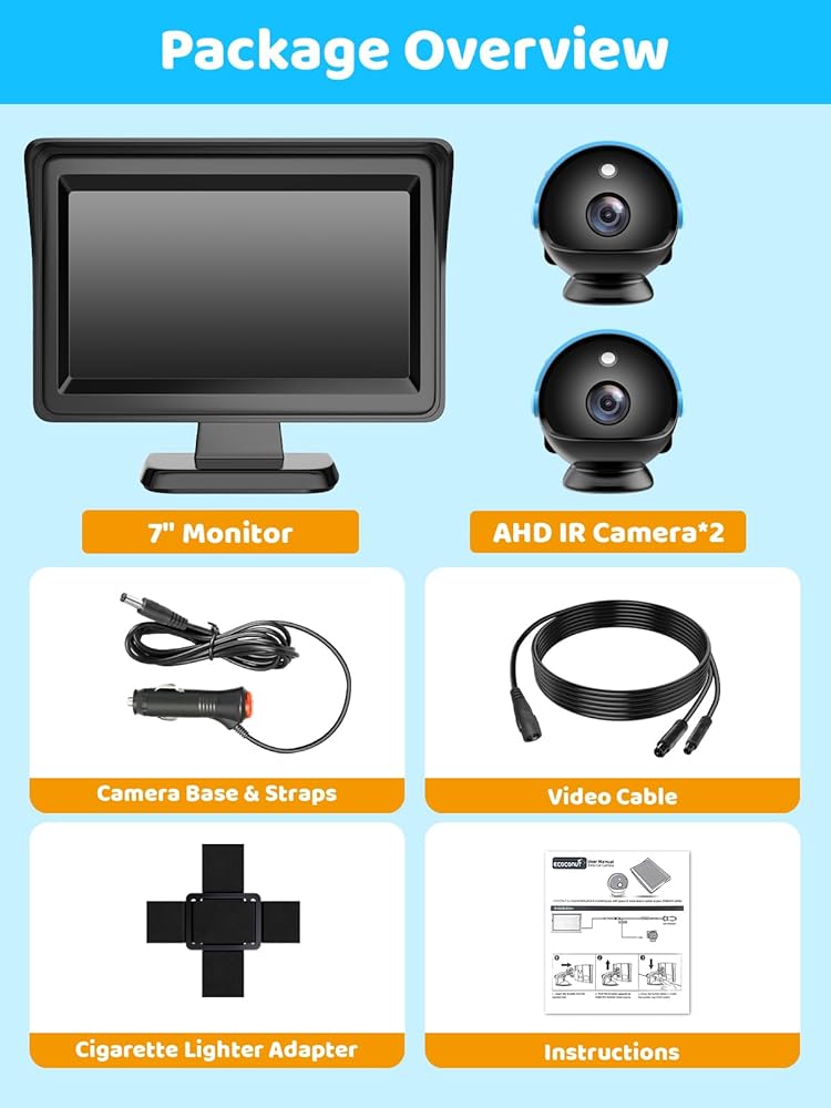 قناة كاميرا مزدوجة ، 7 '' HD 1080p شاشة وكاميرا 2 ، عرض شاشة مقسمة ، رؤية ليلية وكاميرا مرآة للسيارات على نطاق واسع من أجل الظهر ، التوصيل والتوصيل والتشغيل ، 360 درجة ، دوران 360 درجة