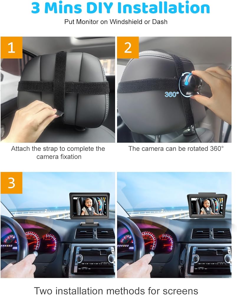 • 📸 【 3 دقائق سهلة التركيب 】 كاميرا المقعد الخلفي للطفل يتم ربطها ببساطة بمسند الرأس حيث يمكن تعديل كاميرا الطفل بالسيارة بسهولة. توصيل الشاشة وتشغيلها. يمكن لكل أب مبتدئ تجميعها بنفسه بسهولة، دون الحاجة إلى أدوات ولا حاجة إلى الدفع.