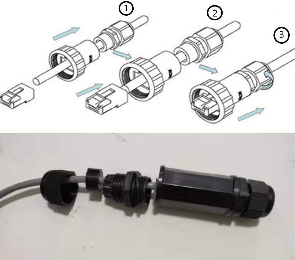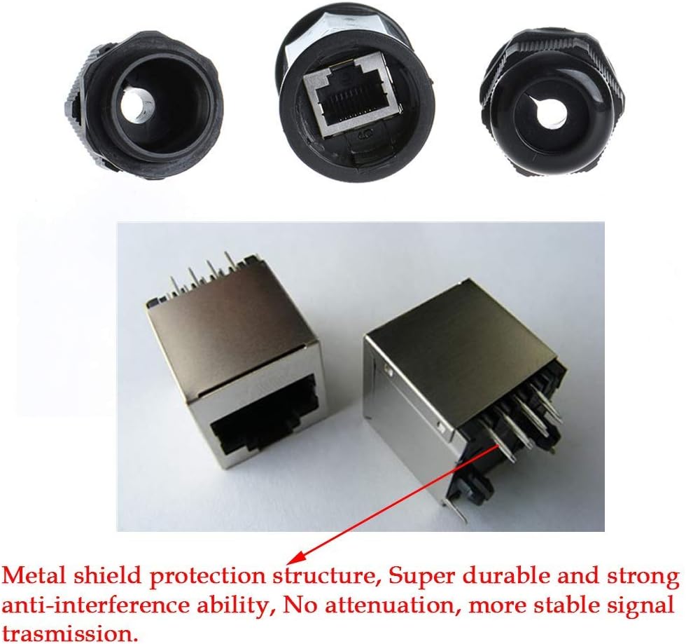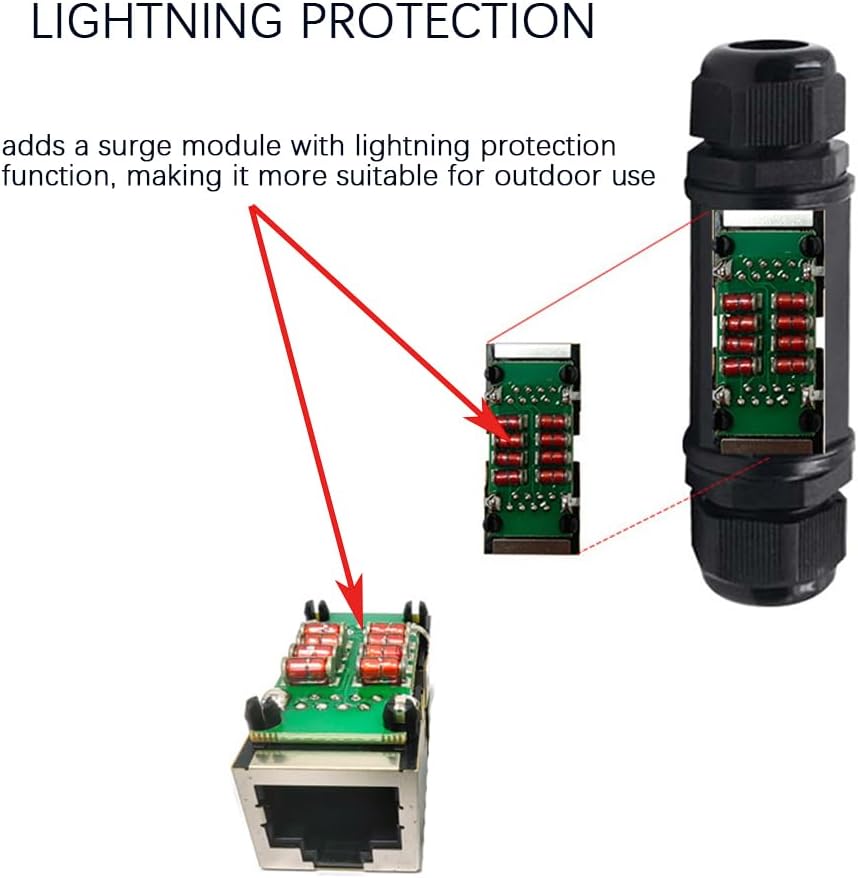 حماية من الإضاءة: يضيف موصل RJ45 المقاوم للماء وحدة تدفق مع وظيفة الحماية من الصواعق، مما يجعله أكثر ملاءمة للاستخدام في الهواء الطلق. حتى في العواصف الرعدية، من الممكن الاتصال بالإنترنت بشكل مستقر.