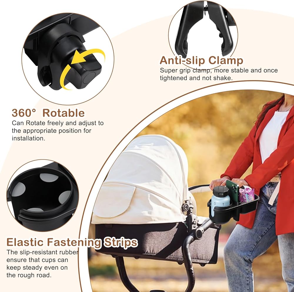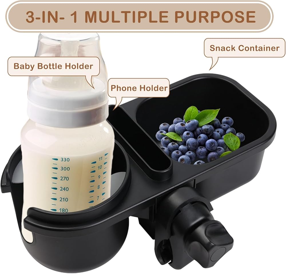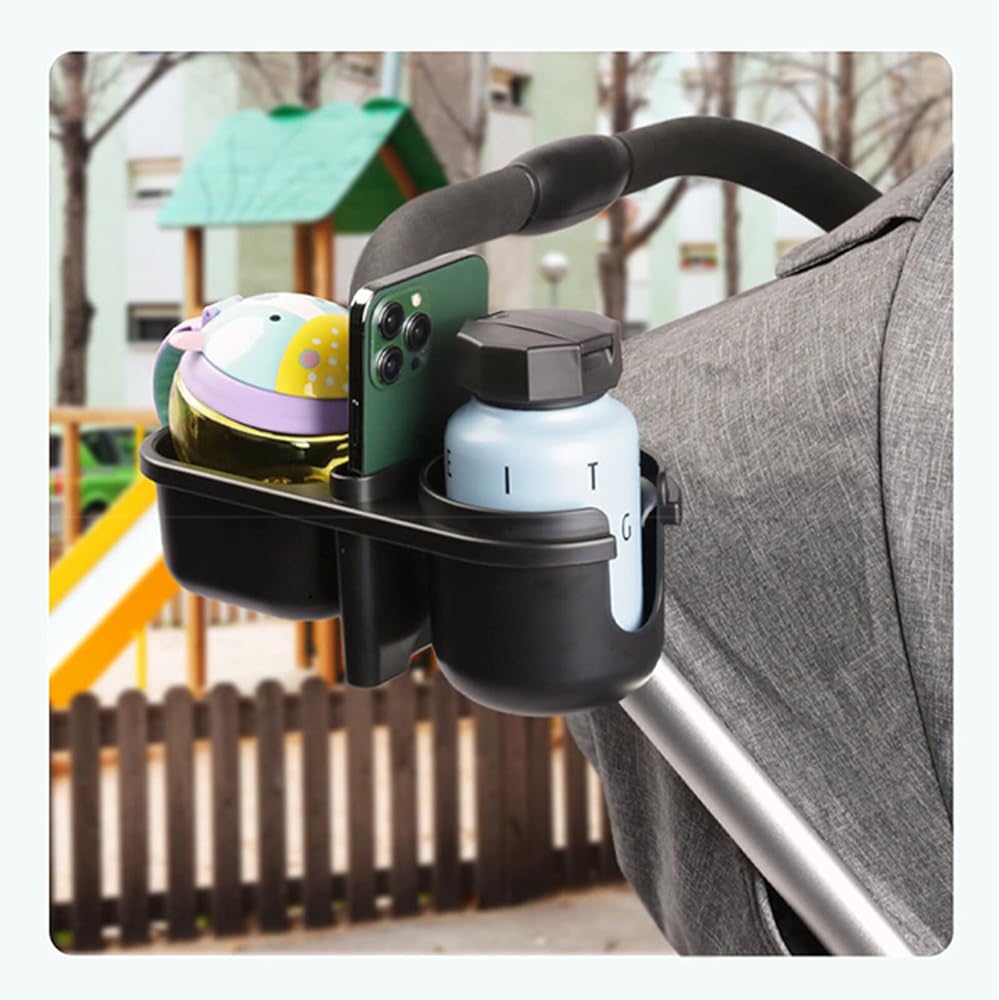 【صينية الوجبات الخفيفة لعربة الأطفال 3 في 1】حامل أكواب عالمي 3 في 1، وحامل هاتف وصينية الوجبات الخفيفة رائعة للسفر وأثناء التنقل، مما يحرر يديك. سهل التركيب دون الحاجة إلى أداة إضافية.