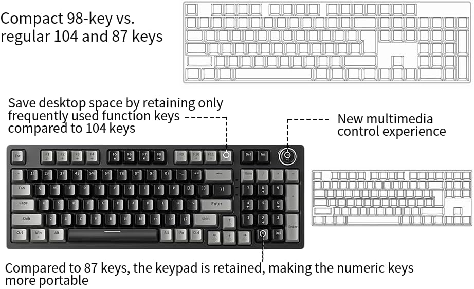 • مجموعة مدمجة مكونة من 98 مفتاحًا مع مفاتيح إضافية حجم ووظيفة أقل دون شغل مساحة