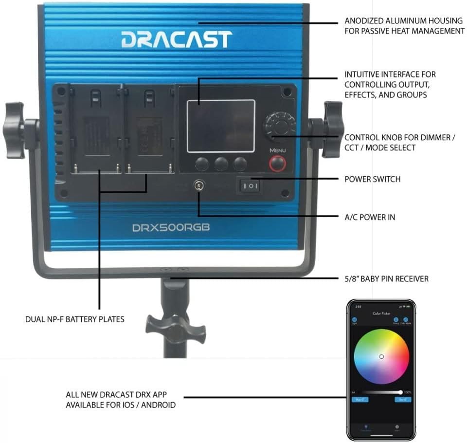【التحكم عن بعد باستخدام تطبيق Dracast DRX】تحكم في مصباح واحد أو عدة أضواء في وقت واحد من أكثر من 100 قدم باستخدام تطبيق Dracast DRX لنظامي التشغيل iOS وAndroid. تعيين مجموعات للتحكم في الضوء المتعدد. التحكم باستخدام منزلقات HSI أو عجلة الألوان RGB. حدد بسرعة وضبط إعدادات هلام الألوان المسبقة والمؤثرات الخاصة (سيارة الشرطة، والألعاب النارية، وضوء الشموع، والستروب، وشاشة التلفزيون، والمزيد). اضبط مستوى التعتيم من 0% إلى 100% بالكامل داخل التطبيق.