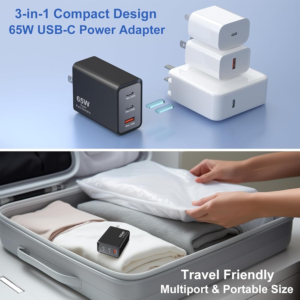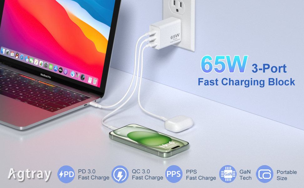 ▷【شاحن USB-C 3 في 1 مناسب للسفر】- شاحن حائط Agtray 65W 3-Port (USB-C×2 + USB-A×1) قادر على شحن 3 أجهزة (كمبيوتر محمول/هاتف/وسادة/ساعة ذكية) /سماعات الأذن) في وقت واحد وبسرعة عالية، مما يوفر الوقت والمساحة. التصميم المحمول ومتعدد المنافذ مناسب للحمل والاحتفاظ به، مثالي للسفر أو رحلة العمل، ويمكنك الاستمتاع بالشحن السريع أينما ذهبت.