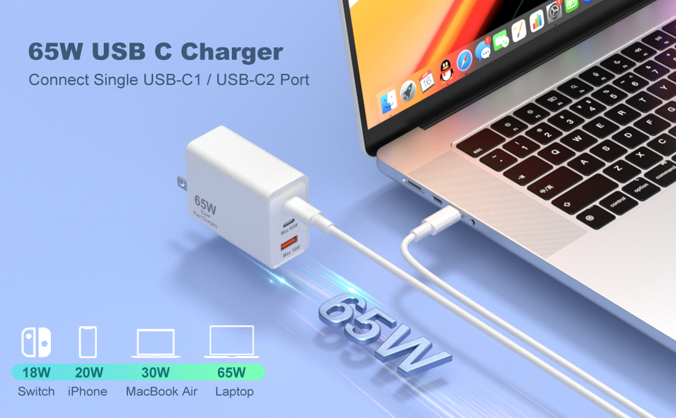 ▷【وحدة شحن سريعة بقدرة 65 وات】- تم تصميم كتلة الشاحن السريع Agtray 65W USB C خصيصًا لسلسلة MacBook / MacBook Air / MacBook Pro. (*يرجى توصيل منفذ USB-C1 واحد أو منفذ USB-C2 واحد للحصول على 65 واط كاملة.) يدعم تقنية الشحن السريع PD3.0 20W وQC3.0 18W وPPS، ويمكنه شحن هاتفك بسرعة من 0% إلى 50% في حوالي 30 دقيقة، بما في ذلك iPhone وAndroid. (* لا يحتوي على كابل شحن سريع)