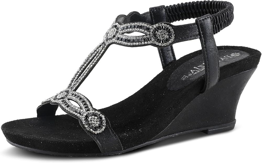 Patrizia Style: SHINING Elegant crystals and cut outs design slip-on sandal on a slightly shiny, silky wrapped comfy wedge. Upper: Synthetic Lining: Synthetic Insole: Synthetic Outsole: Rubber Closure: Slip-on Heel Height: 2 3/4" Platform Height: 3/4" Features: - Comfort, Elastic, Flexible Sole, Stretchable