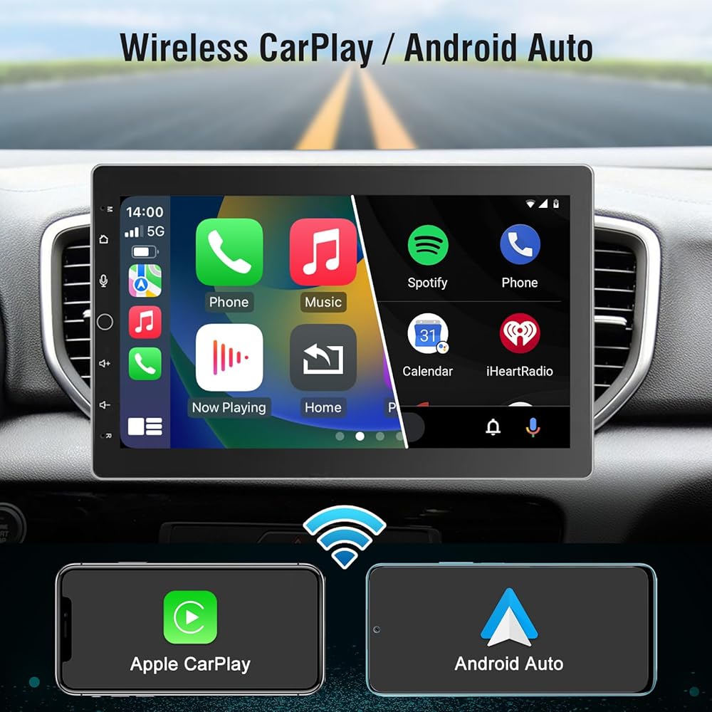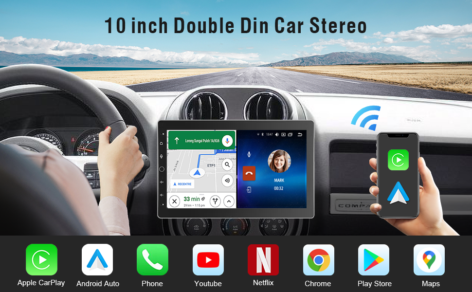 [ستيريو سيارة مزدوج Din مقاس 10 بوصة - امنح السيارة القديمة حياة جديدة] - شاشة ستيريو سيارة مزدوجة Din مقاس 10 بوصة هي قيمة وتكنولوجيا رائعة لإضافة وسائل الراحة الحديثة للسيارات القديمة مع CarPlay اللاسلكي، Android Auto اللاسلكي، بلوتوث بدون استخدام اليدين المكالمات وتدفق الموسيقى، WIFI، تشغيل USB، الملاحة GPS، التحكم في عجلة القيادة، DSP 16 نطاقات EQ، ستعمل سيارة apple carplay الستيريو المزدوجة هذه على منح السيارة القديمة حياة جديدة وتغيير المظهر الداخلي بالكامل بأحدث الميزات