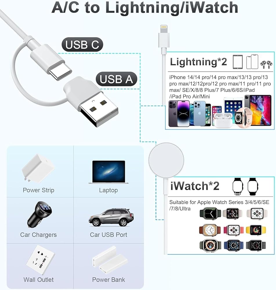 كابل شاحن Apple Watch الجديد لعام 2023 - Apple Watch*2+Lightning*2 شاحن سفر لأجهزة iPhone وApple Watch، شاحن ثلاثي iWatch مغناطيسي بطول 6أقدام/1.8 متر لأجهزة iPhone Apple Watch Airpods