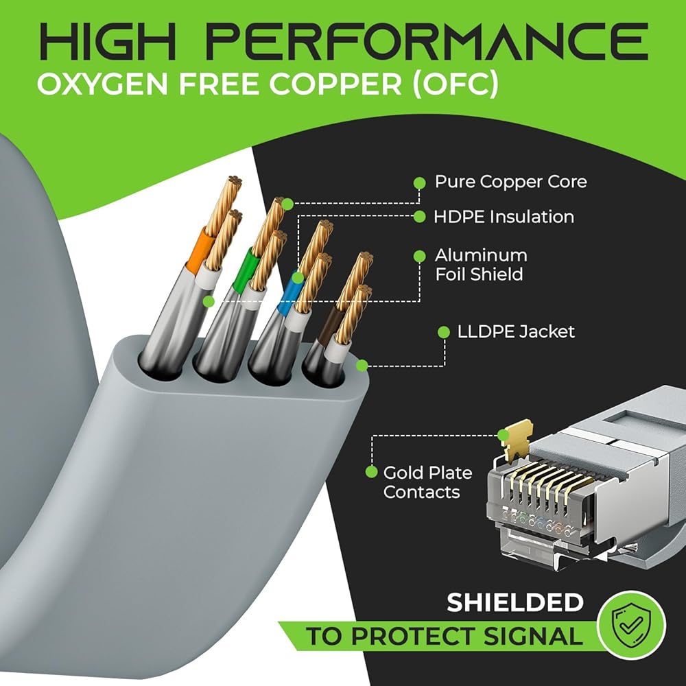 عالي التحمل وأداء فائق - كابل الزوج الملتوي (FTP) الخاص بنا، الذي يتميز بالنحاس الخالي من الأكسجين (OFC) للحصول على أقصى قدر من التوصيل، ويدعم عرض النطاق الترددي ويعزز سرعات النقل، مما يضمن بث سلس لمقاطع الفيديو عالية الدقة والموسيقى وتصفح الشبكة والفيديوهات الفائقة. ألعاب السرعة. يعمل الكابل المحمي والموصلات المعدنية على تقليل تداخل الإشارة بشكل كبير، مما يعزز جودة اتصالك بالإنترنت.