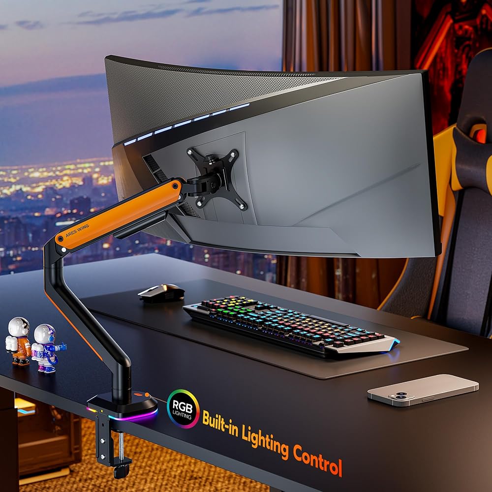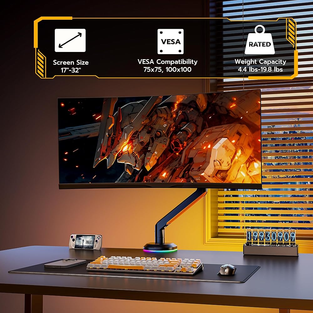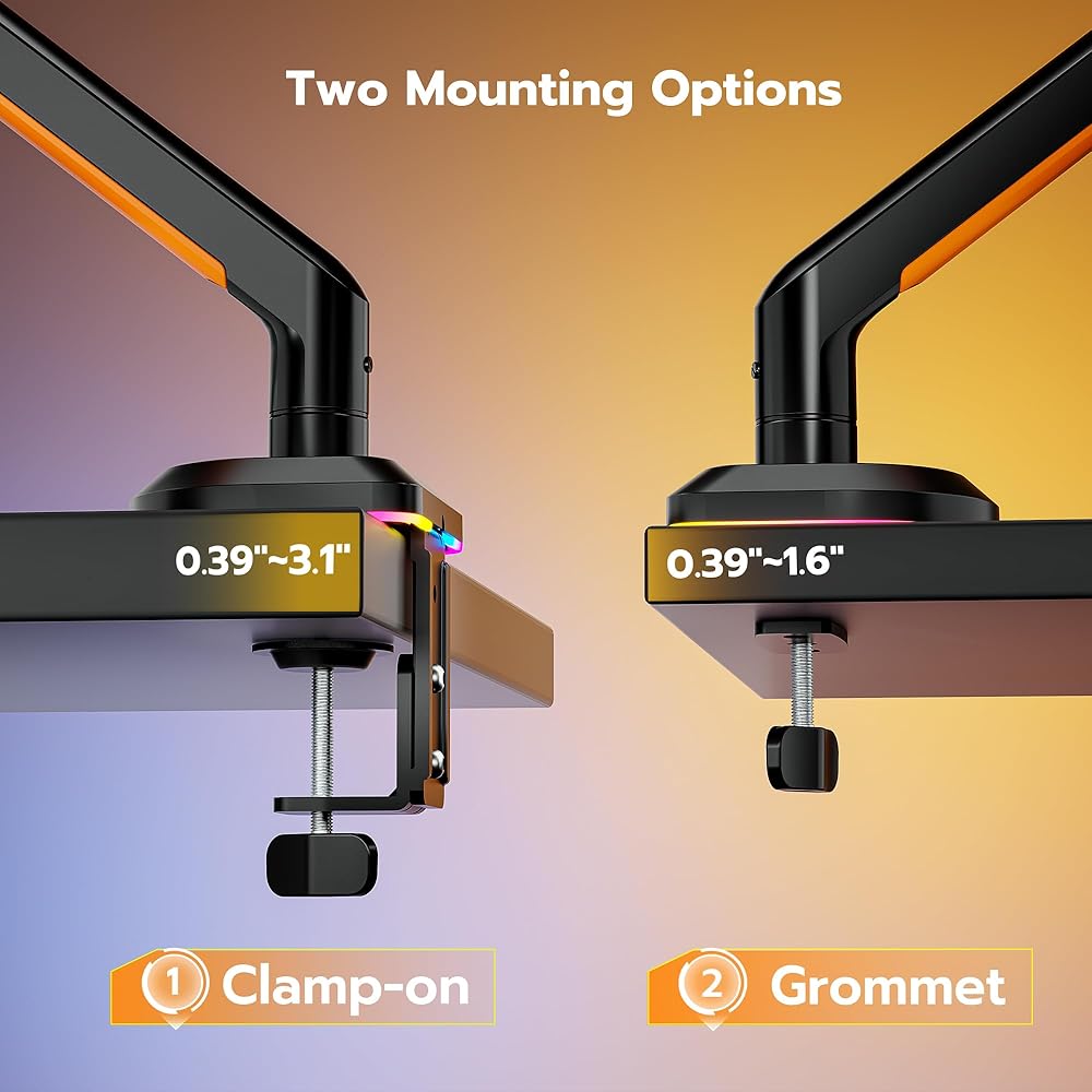 【توفير المساحة وتأثير RGB】استخدام حامل ذراع الشاشة الخاص بنا يحرر مساحة قيمة مع إدارة الكابلات. عند عدم الاستخدام، يمكن دفع مكتب تثبيت الشاشة المنحني على الحائط وطيه بالكامل، مما يوفر مساحة للكمبيوتر المحمول ولوحة المفاتيح والكمبيوتر اللوحي. تم تصميم حامل الشاشة المثبت على المكتب المزود بـ 13 مؤثرًا ضوئيًا ديناميكيًا متدرجًا لتهدئة عقلك، وتوفير شعور بالراحة والاسترخاء أثناء جلسات الألعاب المكثفة.