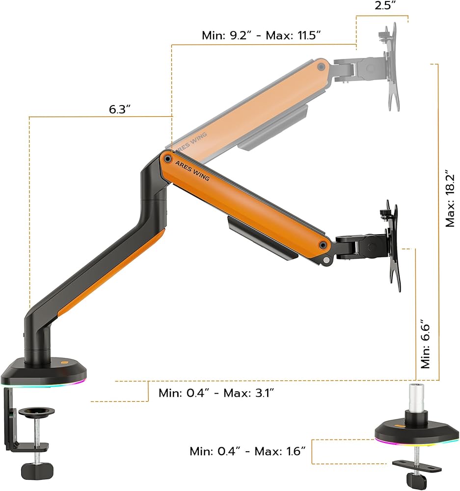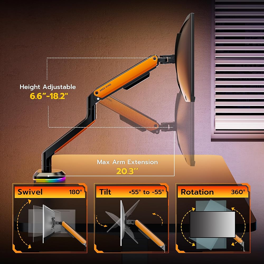 【حركة كاملة】يمكن لحامل شاشة الكمبيوتر Ares Wing أن يدور 360 درجة، والإمالة ±55 درجة، والدوران ±90 درجة. يمكنه رفع الشاشة إلى 18.2 بوصة وتمتد إلى 20.3 بوصة. فهو مصمم هندسيًا، ويوفر حلاً مناسبًا لمحطة عمل مريحة. مع التعديل بيد واحدة، يمكنك العثور على زاوية التوازن الصحيحة، مما يقلل من خطر إجهاد الرقبة والظهر. مجهزة بفتحات تثبيت VESA مقاس 75 × 75 مم و100 × 100 مم.
